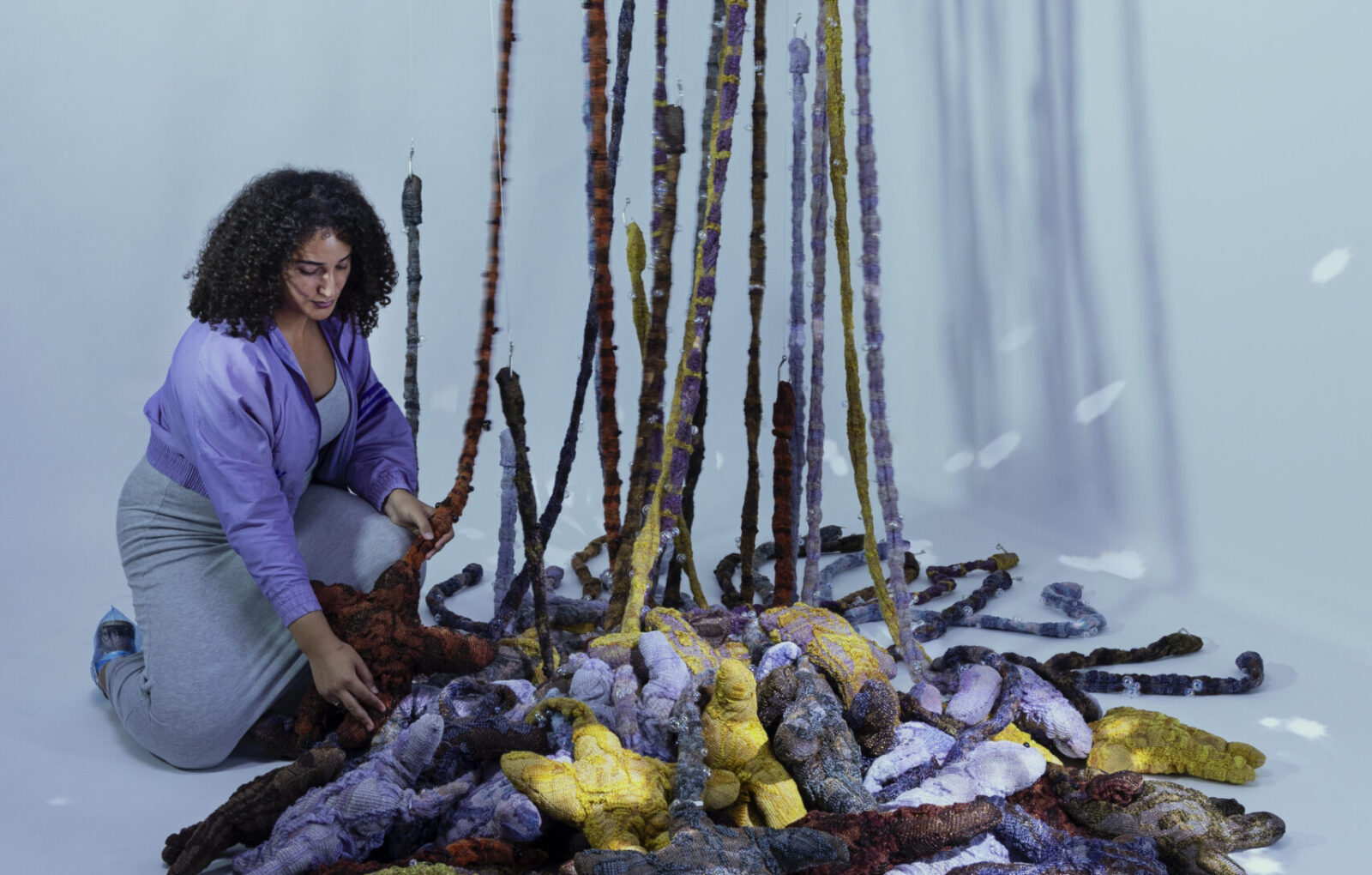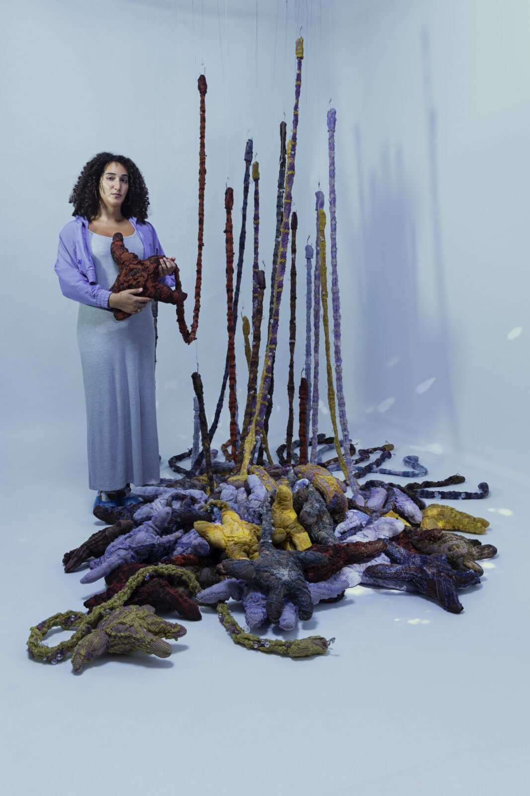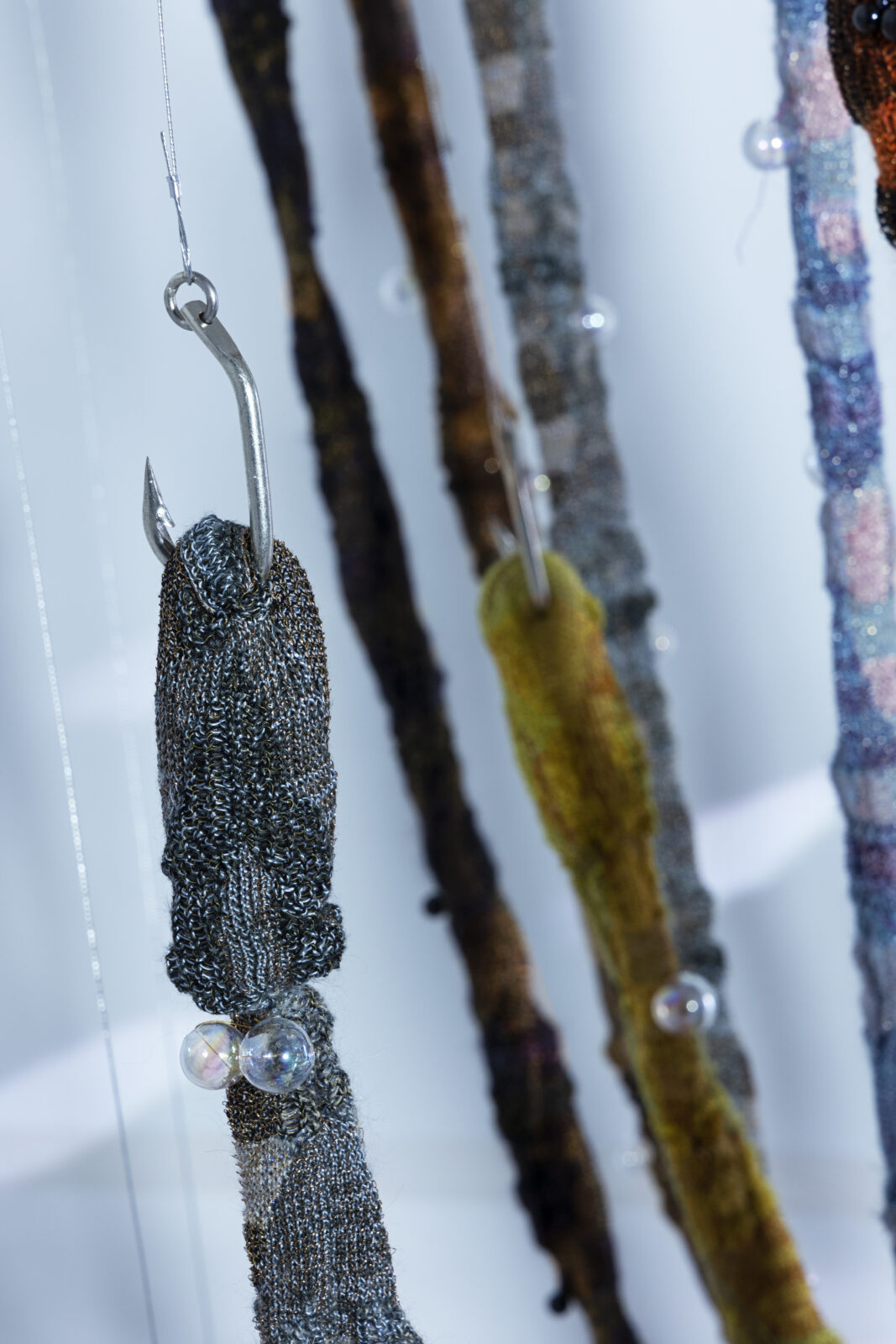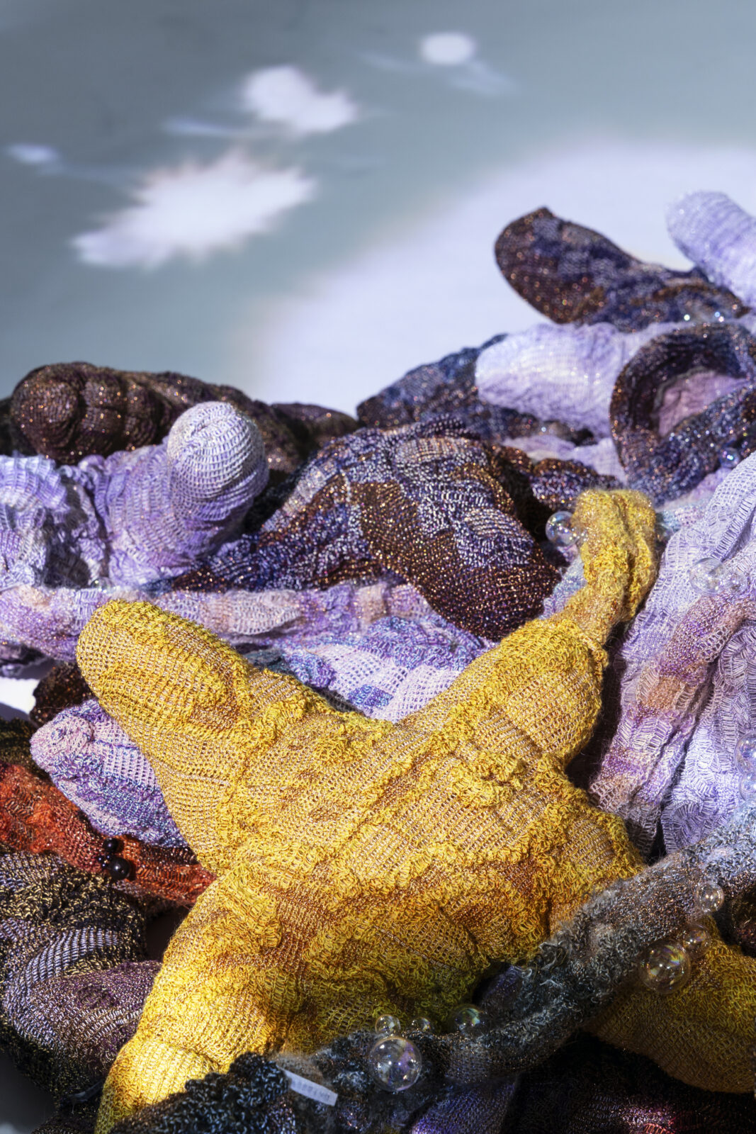 Commissioned by the TextielMuseum, Ada M. Patterson developed a new work in 2023. In this installation, Patterson honours bodies that change in order to survive. Starfish can sever their own limbs as a survival tactic. However, climate change is disrupting starfish’s ability to regrow lost limbs. Patterson’s starfish are suspended between two states: stuck together and pulled apart. Their limbs are extended. They become something else. There is no going back. How might we accept the new worlds and conditions we create when we change ourselves?