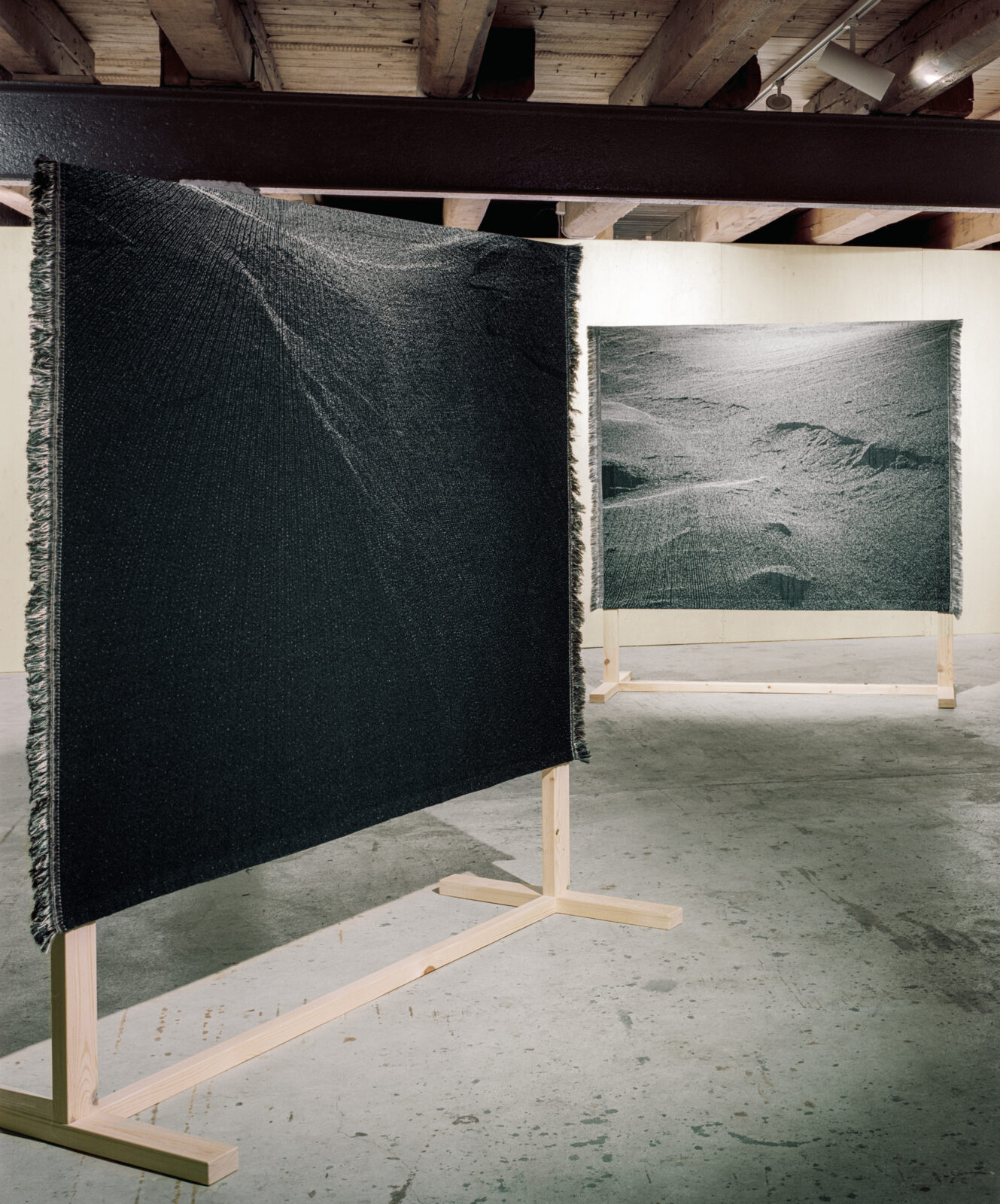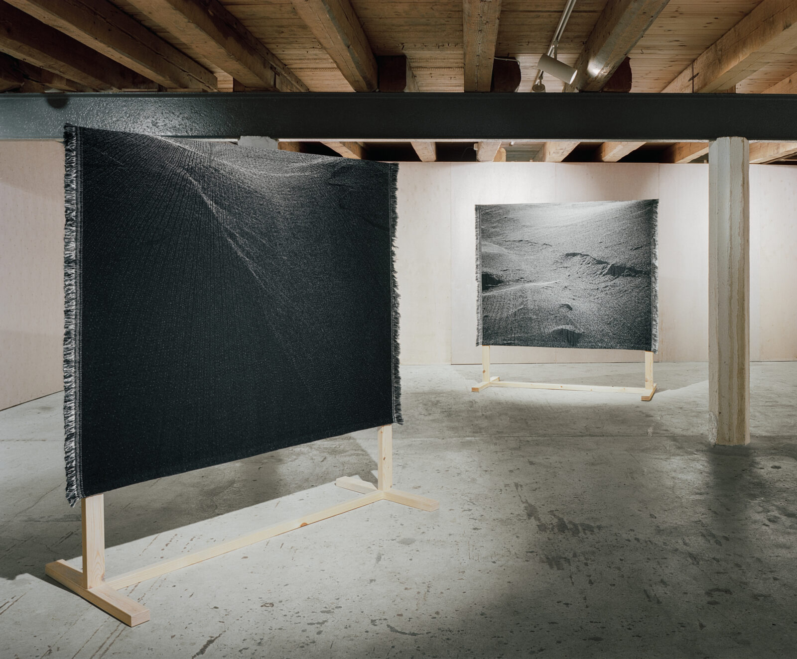 During her stay in Svalbard, Serné witnessed an avalanche caused by rain, a phenomenon that is becoming increasingly common due to global warming. The sight reminded her of nocturnal landscapes or extraterrestrial worlds, which she translated into digital patterns for the loom. Up close, the textiles appear soft and fluffy, with glimmering lines and dots; from a distance, the shapes become clearly visible.