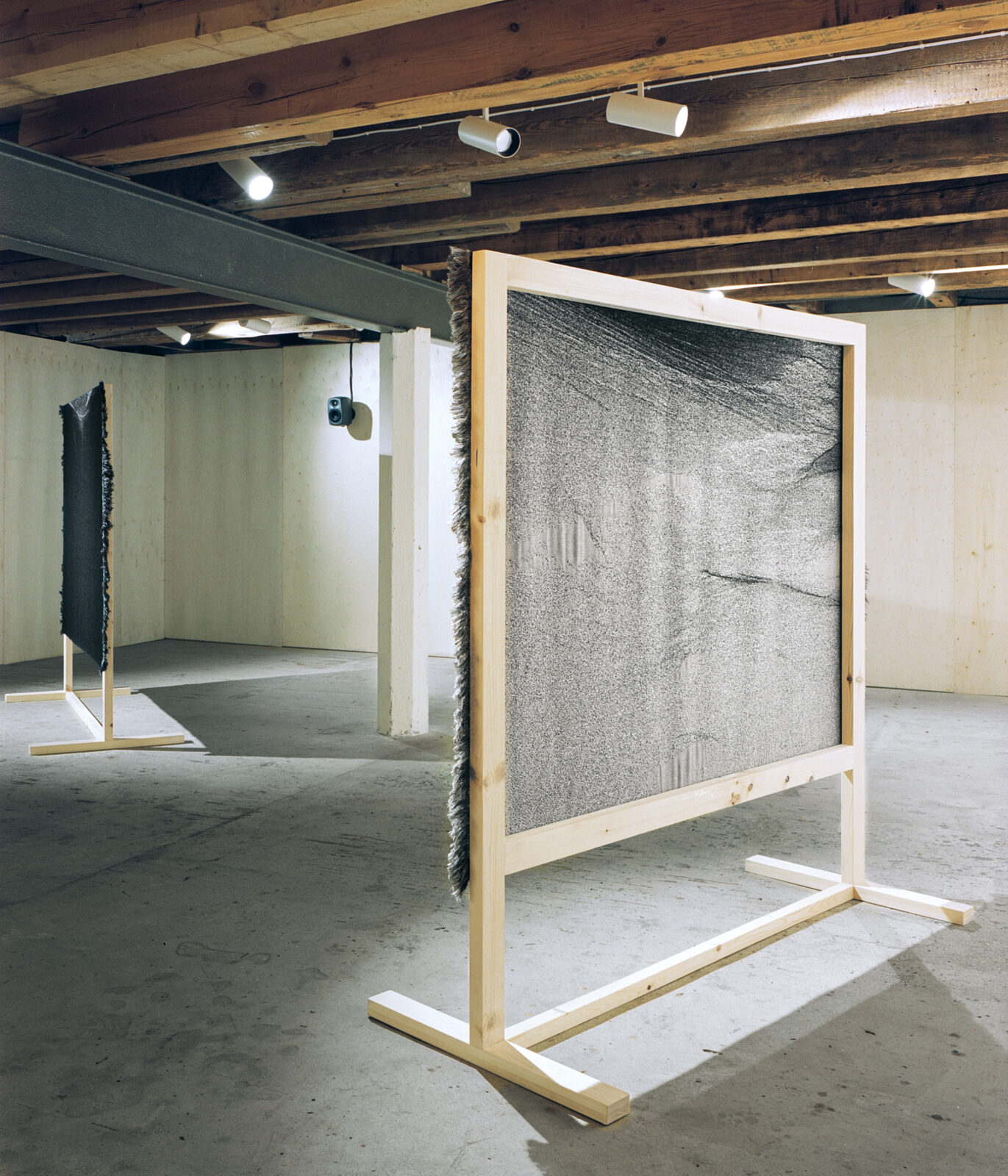 Serné combined the textiles with sound: from speakers along the walls, voices can be heard humming, singing, and breathing, occasionally interrupted by deep breaths that evoke animals or deep sleep. The word hymnos refers to a song or choir text and simultaneously creates a semantic link with weaving, through which Serné explores the harmonious relationship between image, sound, and material.