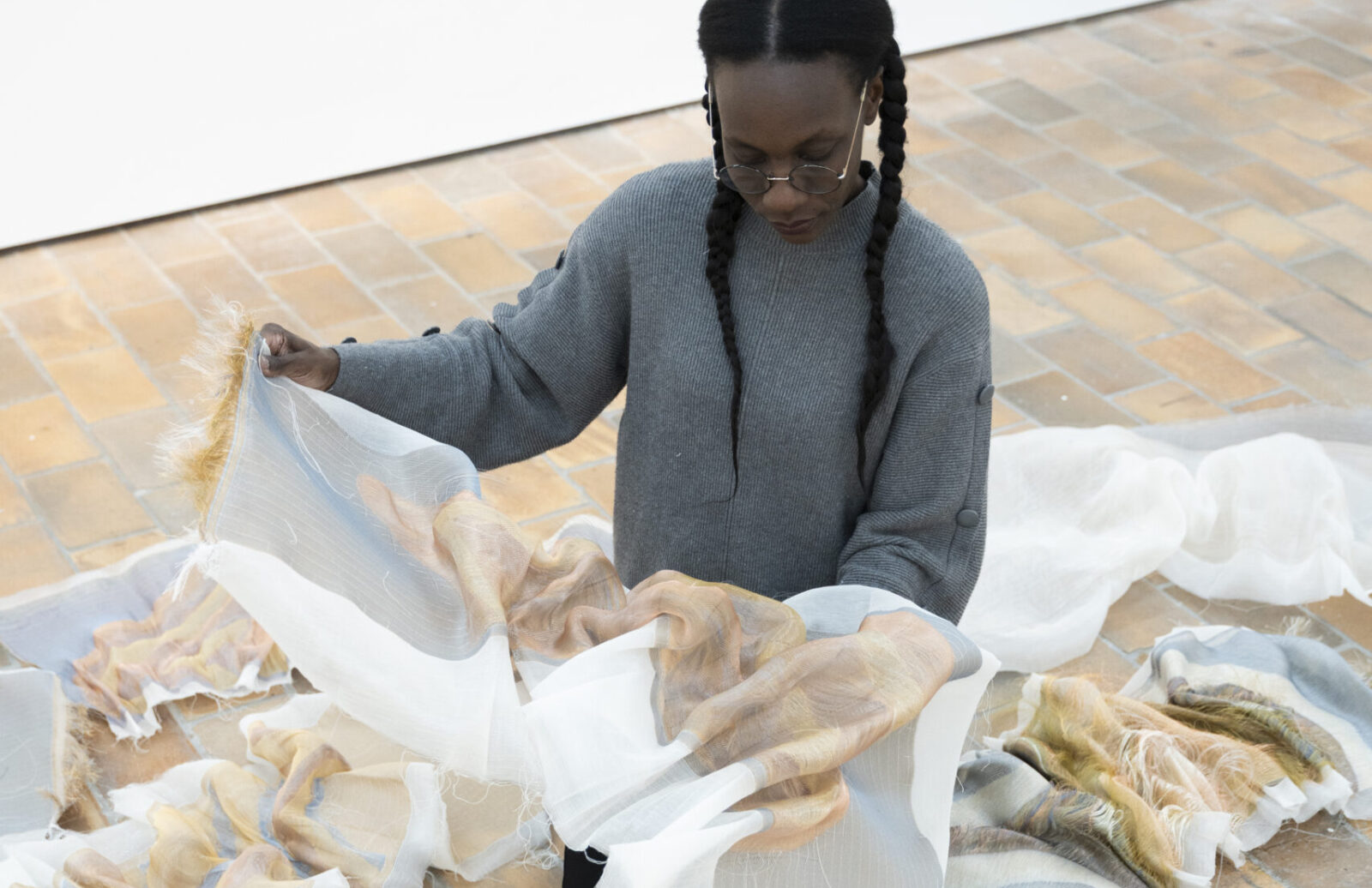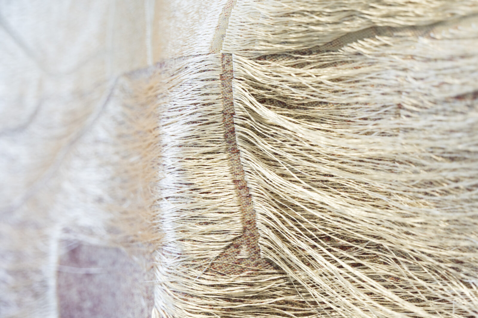 On the wall hanging, with a subtle colour gradient from beige to soft orange, large cowrie shells form the central motif, woven with glossy viscose yarn in short floats. Cowrie shells were used as currency in Africa and represent an economic mode of operation; the colour gradient abstractly refers to a sunset, a symbol of mourning rituals and new beginnings. The floor pieces trace the contours of Fort Jesus in Mombasa, an important hub in the colonial trade network. The floor textiles were created using an experimental multilayer weave of polyester monofilament, linen, and copper wire. By manually pulling on woven transparent polyester threads afterwards, the fabric lifts to form a three-dimensional surface.