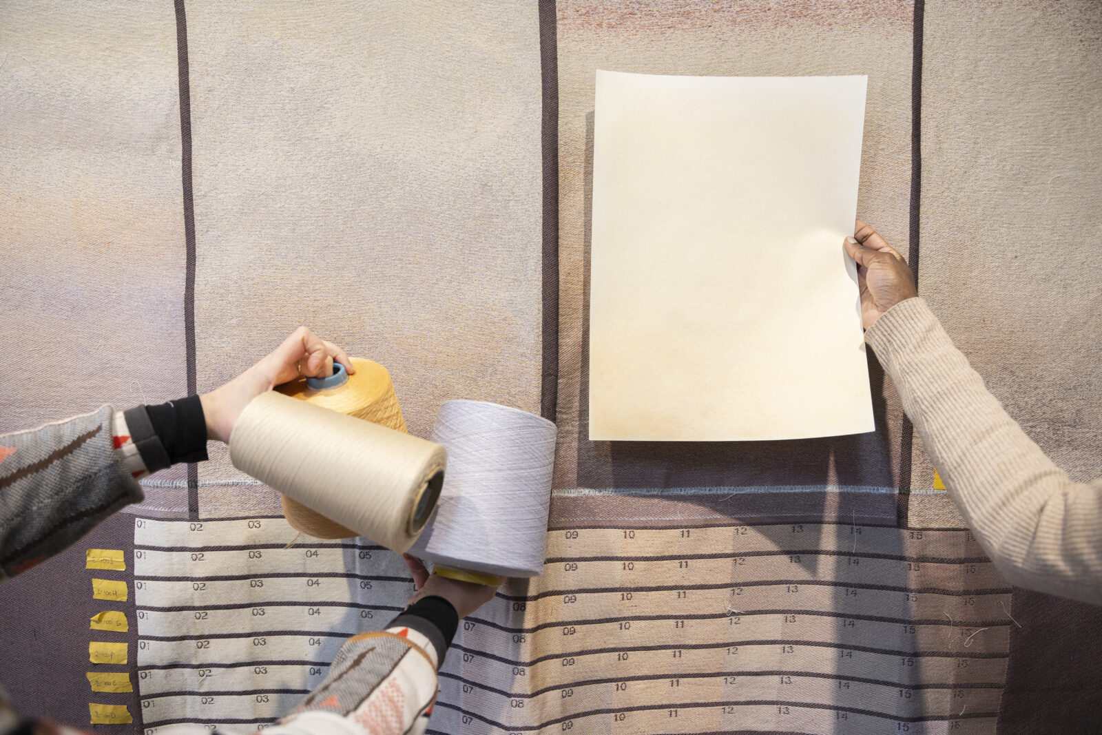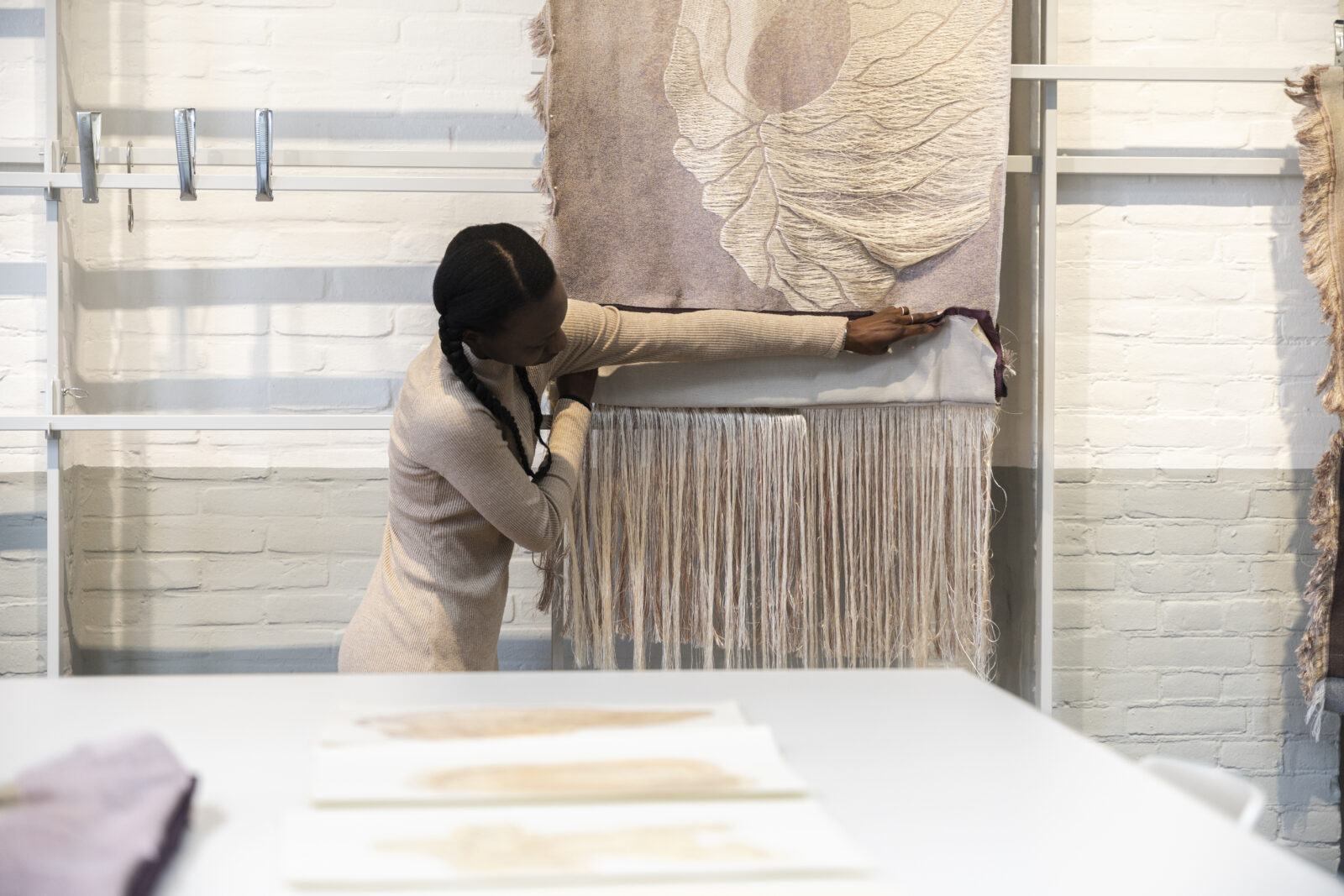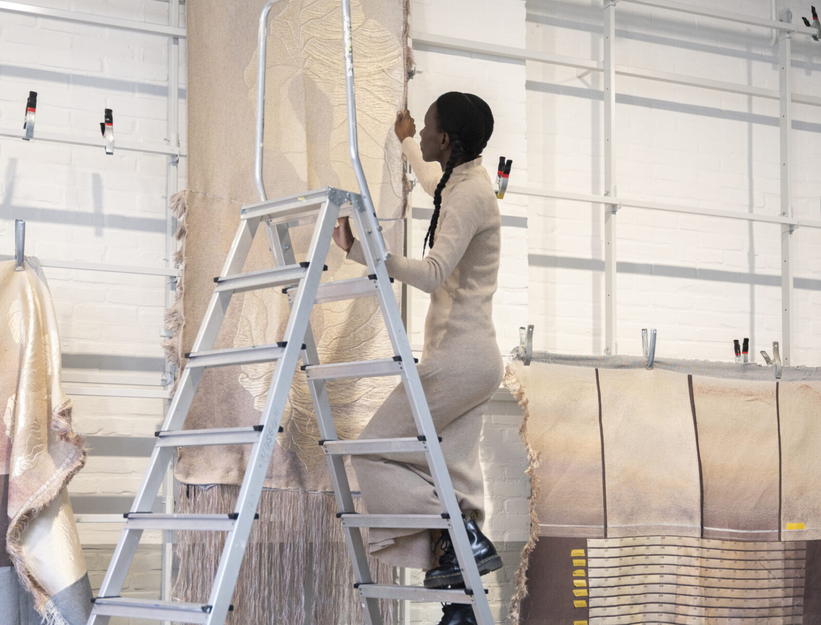 In response to the painful history of colonial trade and cultural appropriation, of which the sample books of the Leidsche Katoenmaatschappij bear witness, Ayo developed the installation ‘Neither Rhythm Nor Repetition’, commissioned by the TextielMuseum. The work consists of woven textiles, glass cowrie shells, and a sound collage. She had a monumental wall hanging woven, measuring 3.5 by over 4 metres, along with three-dimensional floor pieces.