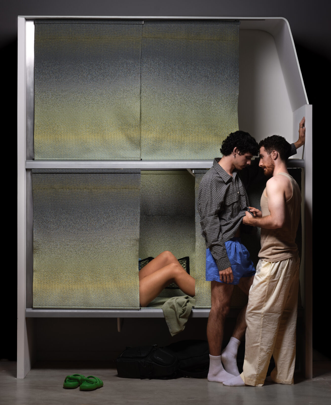 By varying knitting structures and filling, zones of support are created alongside more flexible areas that adapt to the body. Instead of four colours, Ascençao used eight to achieve a richer colour gradient. The knitted surface extends beyond the bed to form panels that absorb sound, filter light, and provide privacy. The system is lightweight, easy to maintain, fully washable, and makes night travel more comfortable and enjoyable.