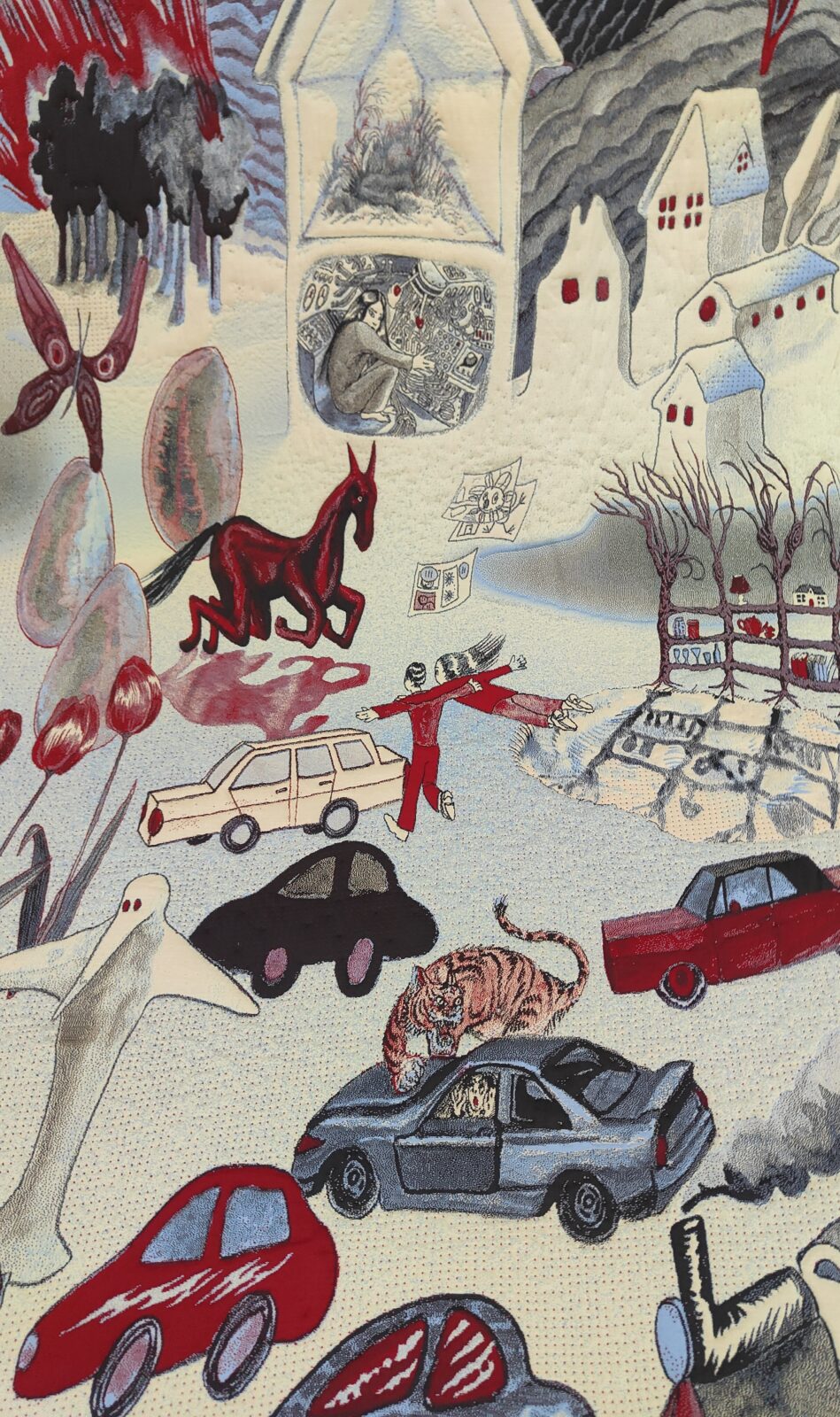 ‘The Room Without Air’ is Clara Nop’s graduation project, based on her personal archive of dreams. The work consists of a large knitted wall hanging, composed of illustrations from sixteen recurring dreams. The dreamy, sometimes surreal images were originally captured in small watercolours and then translated into textile using a circular knitting machine, creating a tangible, layered landscape.