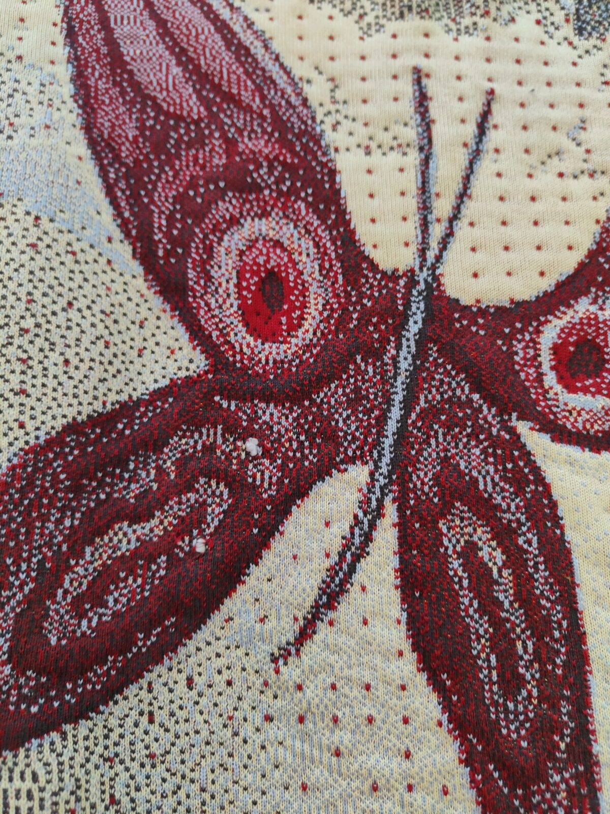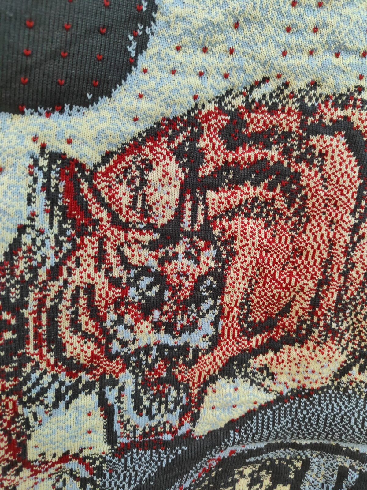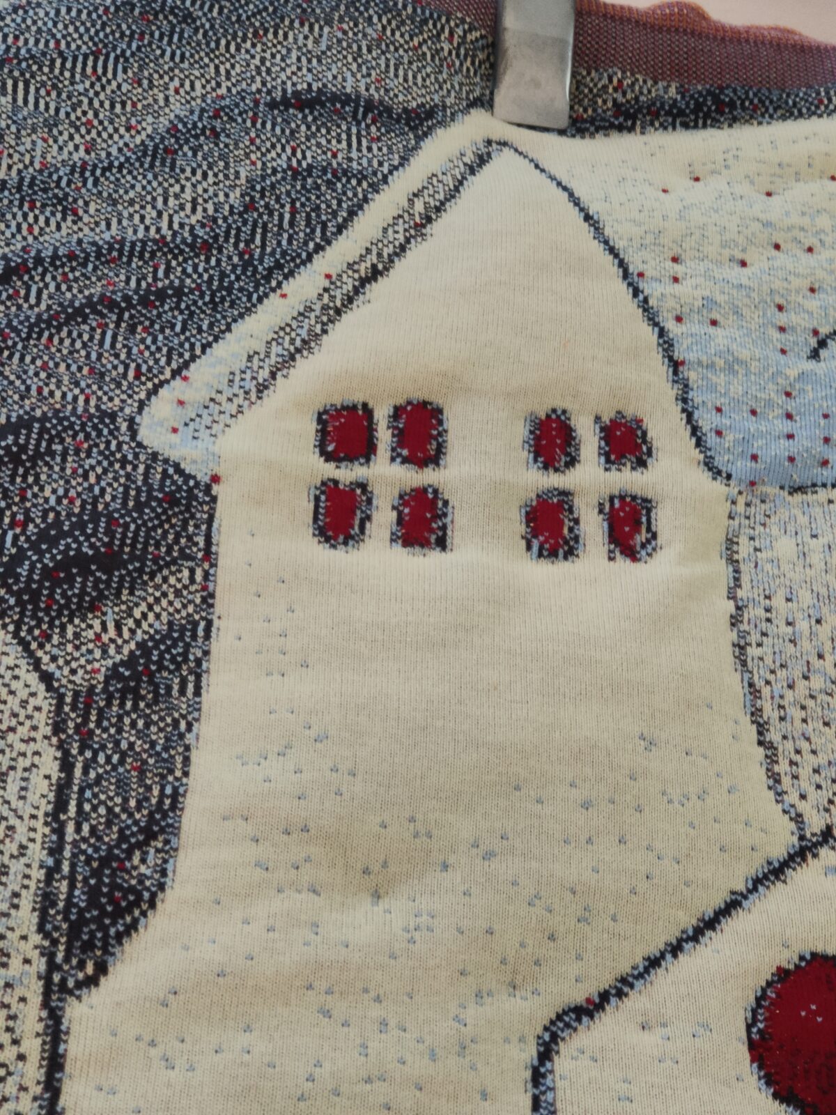 In the lab, Clara used Jacquard-knitting technique to produce a double-sided fabric in four colours. The greatest challenge was scaling up her delicate paintings (approximately 10 × 10 cm) to a monumental format while preserving gradations, details, and atmosphere.