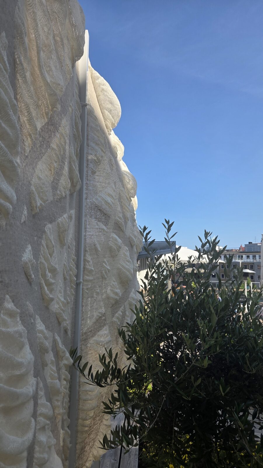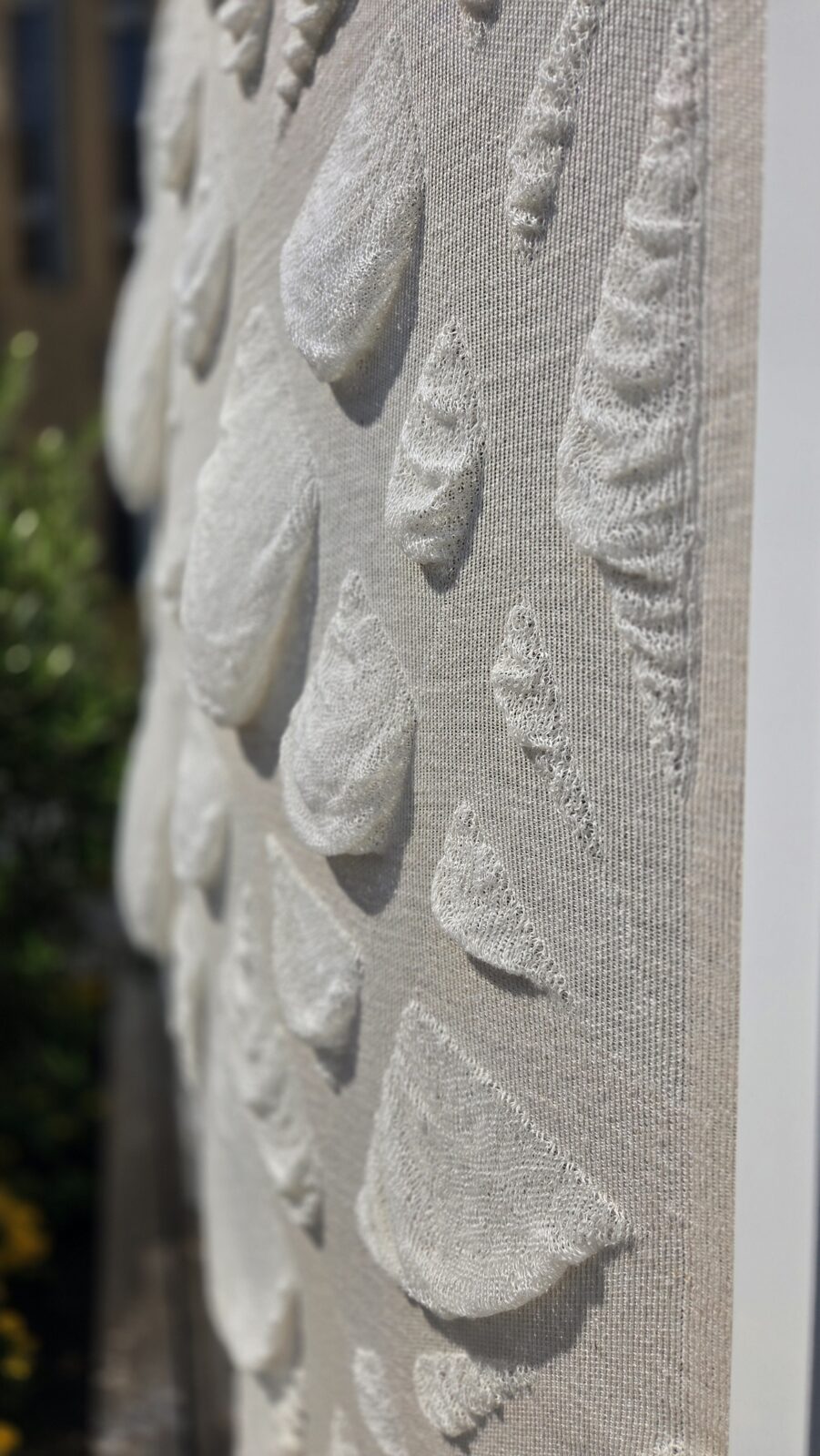 Hörteborn created large knitted textile works made entirely from hemp yarn. By combining two knitting techniques, she produced panels that move with the wind and subtly change form while maintaining a strong underlying structure.