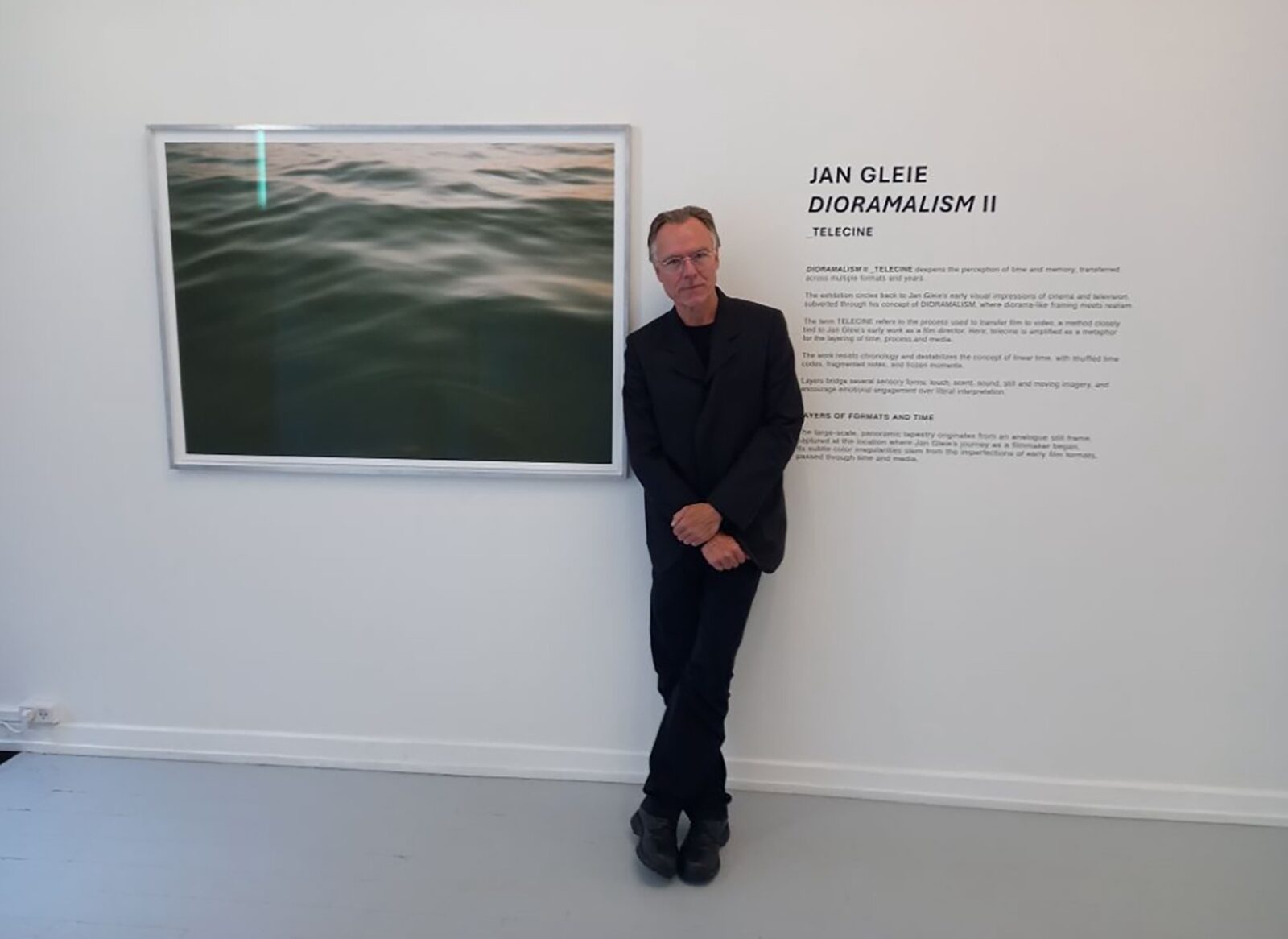 In ‘DIORAMALISM II’, Jan Gleie explores how memory functions, revealing the layered nature of time and media. At the centre of the exhibition is a panoramic Jacquard-woven wall hanging, based on a film still from the location where Gleie began his career as a filmmaker. The design has been translated into a textile made from linen yarns, with soft colour gradations that clearly render the details of the original image.