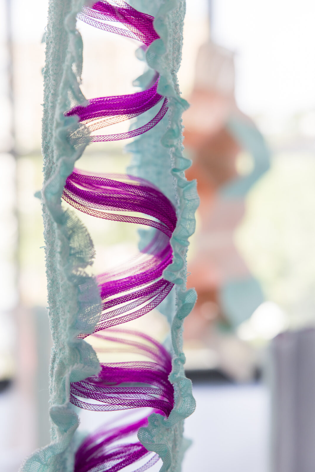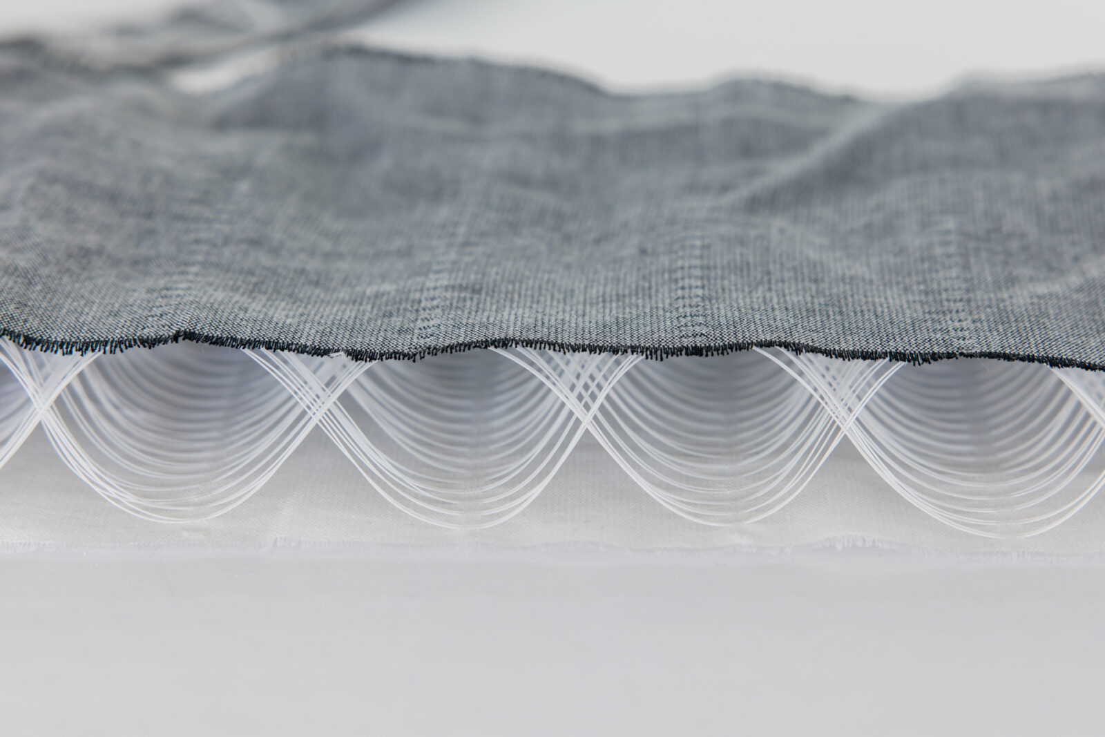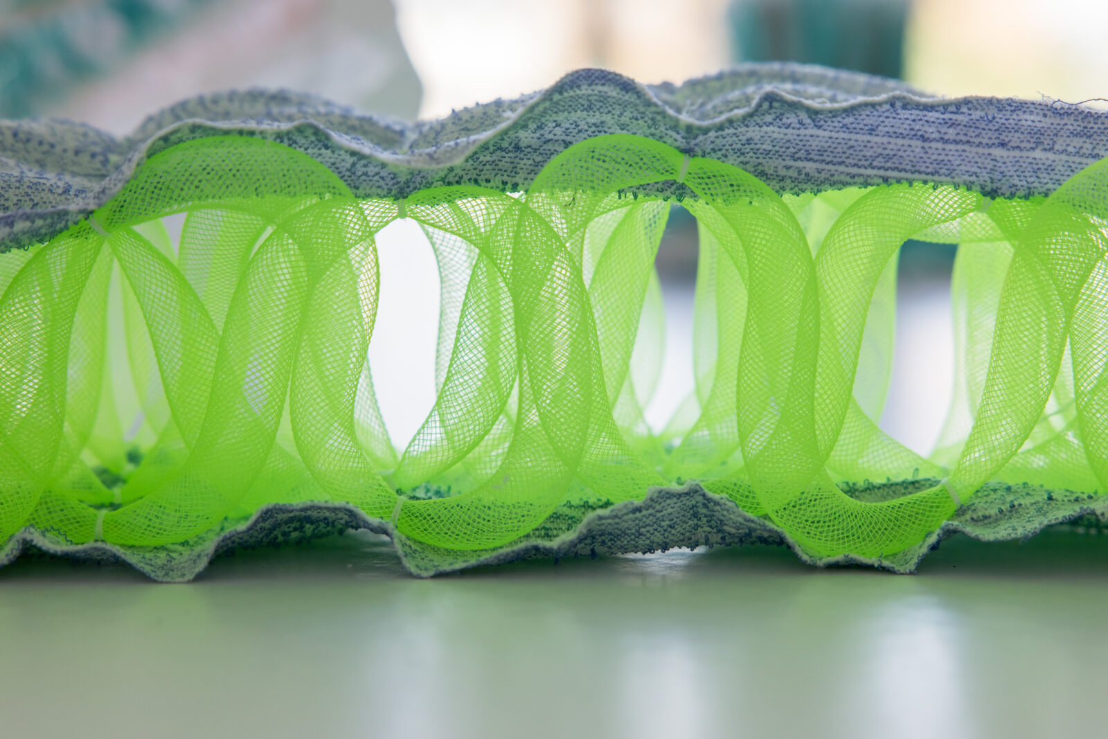 For ‘Akènes: Spacer Weaves’, Juliette Rambour explored how weaving techniques can create volume. The project resulted in a collection of free-standing woven forms that emerge without stitching or assembly. The “akènes” are divided into four groups: ‘spacer akènes’, ‘volume akènes’, ‘alveolar akènes’, and ‘texture akènes’. Each group has its own type of volume, which takes shape during the weaving process. In the ‘spacer akènes’, for example, the polyester monofilament connecting thread moves between two layers, forming an airy internal skeleton.