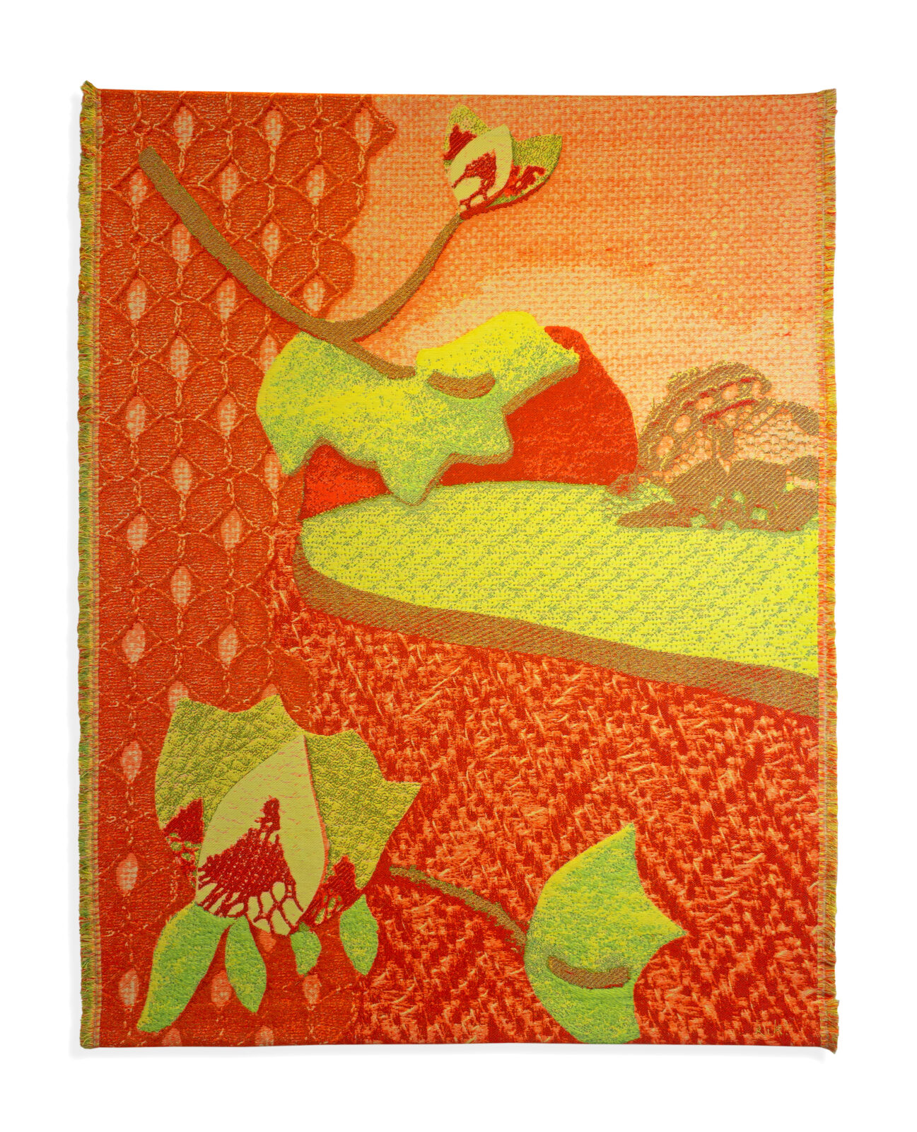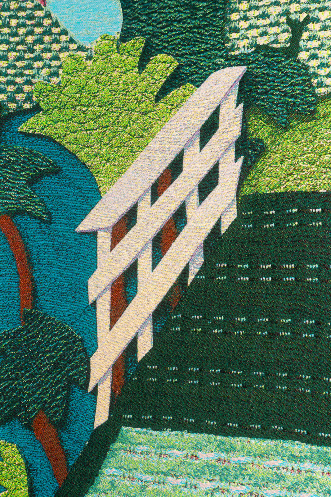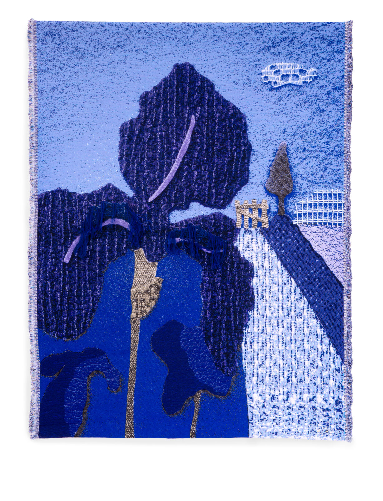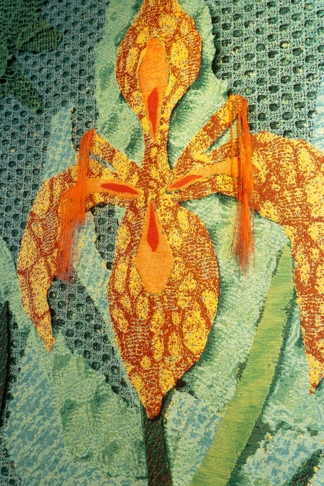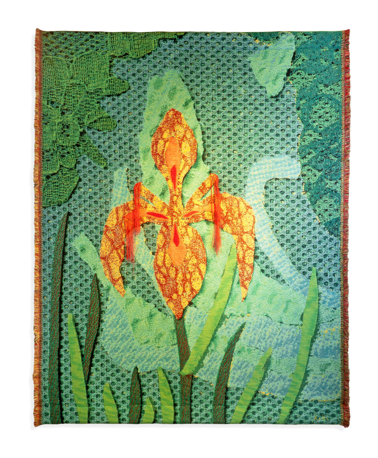 ‘Memories of a Garden’ by designer Kiki van Eijk consists of a series of four woven wall hangings, ‘IRIS’, ‘FLAG’, ‘BRIDGE’ and ‘TULIP TREE’ and was developed during an artist-in-residence at Marc Mulders’ mobile garden studio on the Baest Estate. Van Eijk worked in a collage-like manner: line drawings were translated into small textile collages, scanned and enlarged into compositions suitable for weaving.
