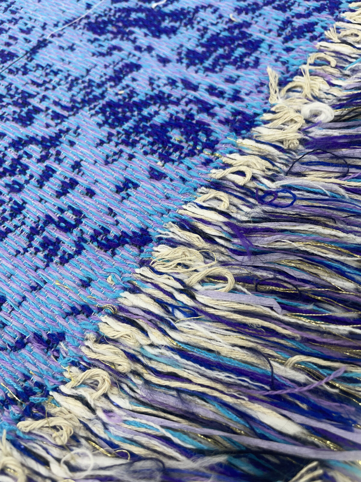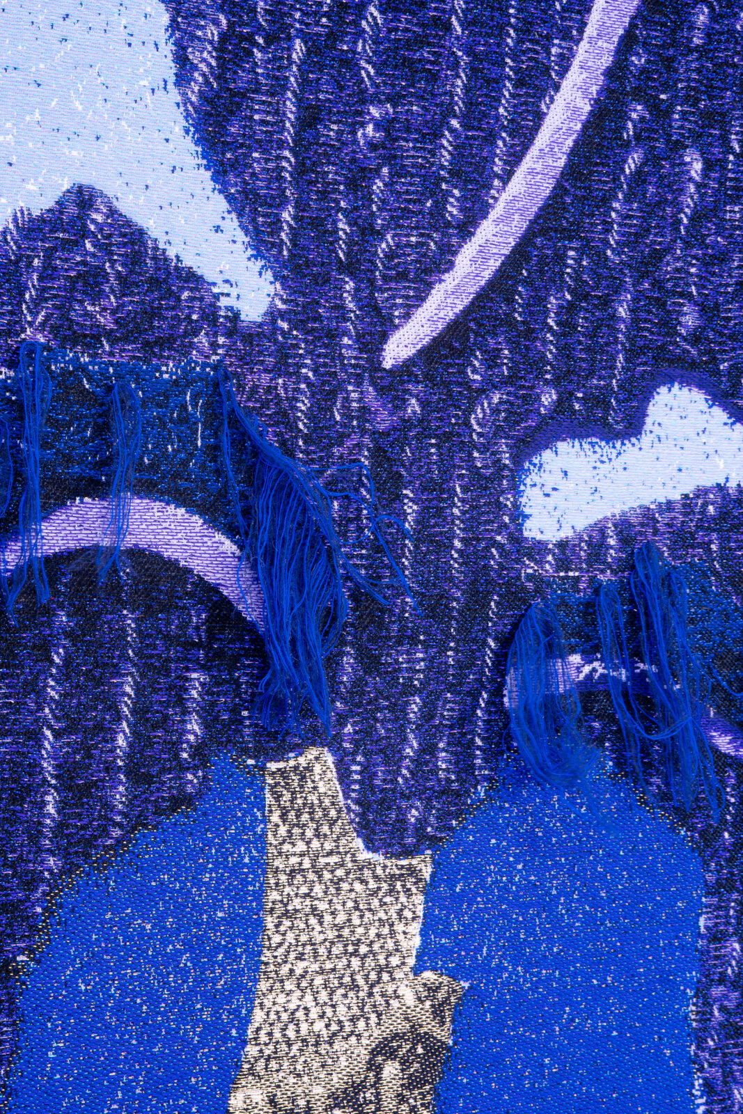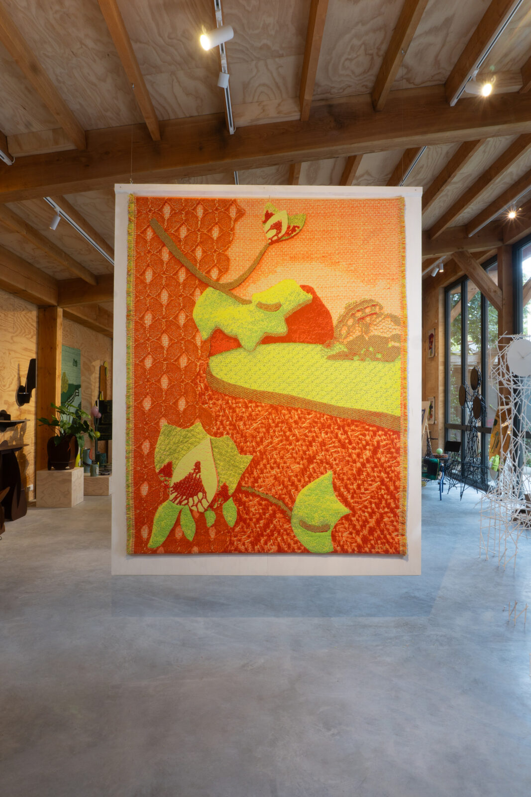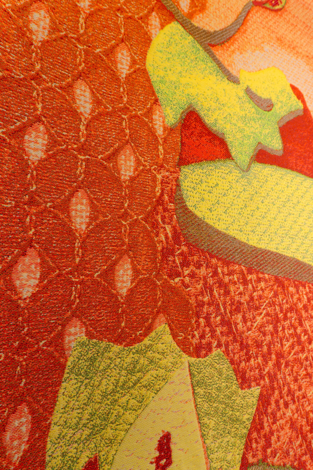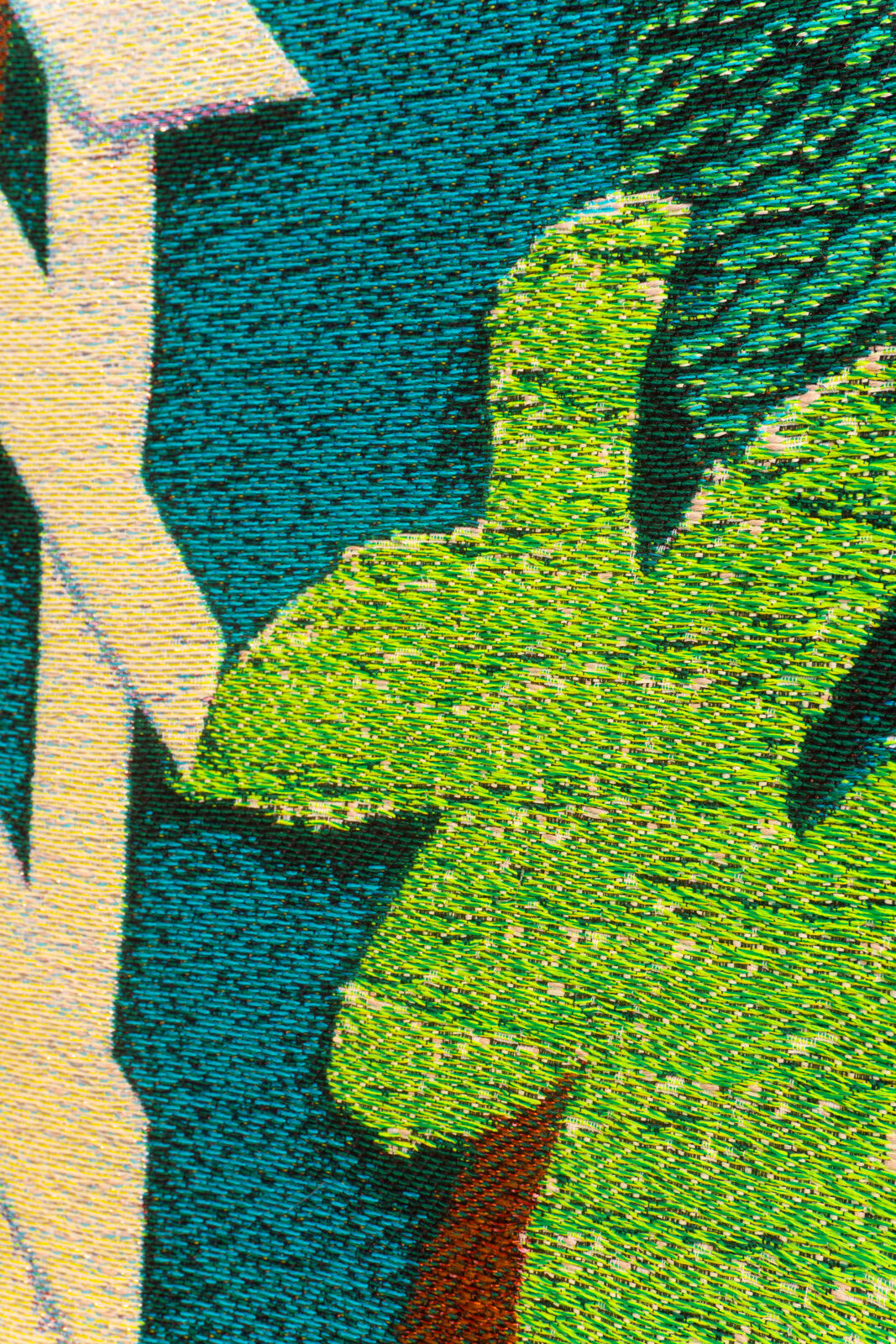 ‘Memories of a Garden’ by designer Kiki van Eijk consists of a series of four woven wall hangings, ‘IRIS’, ‘FLAG’, ‘BRIDGE’ and ‘TULIP TREE’ and was developed during an artist-in-residence at Marc Mulders’ mobile garden studio on the Baest Estate. Van Eijk worked in a collage-like manner: line drawings were translated into small textile collages, scanned and enlarged into compositions suitable for weaving.