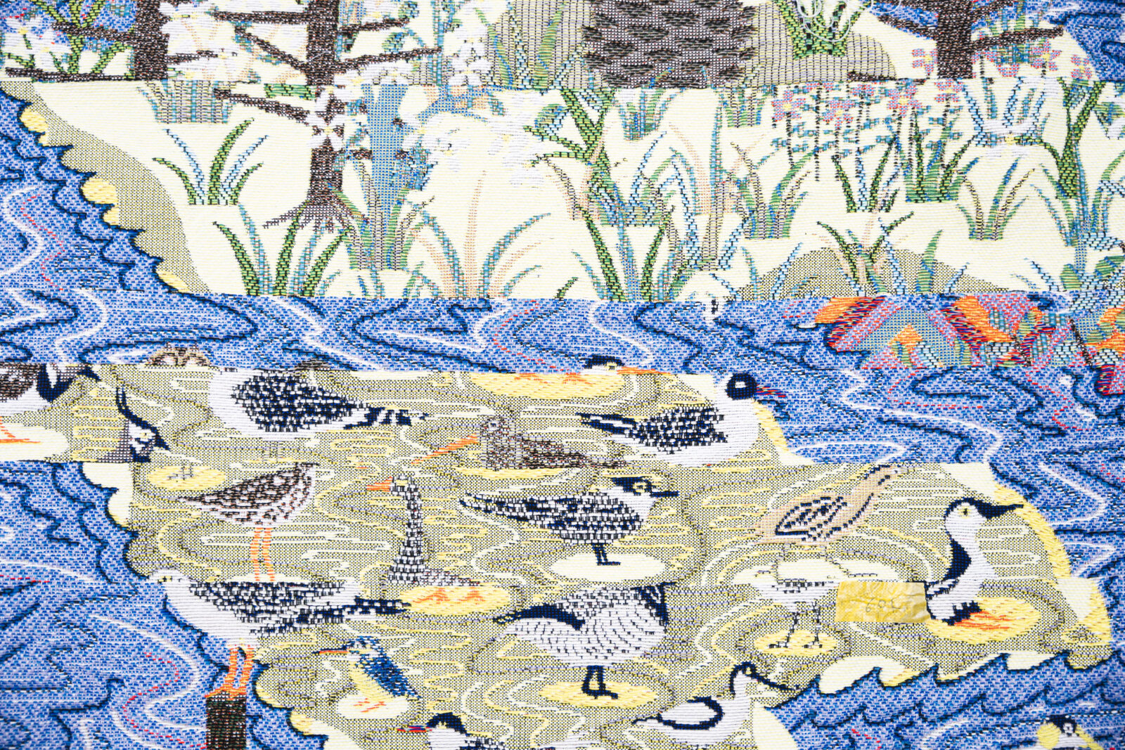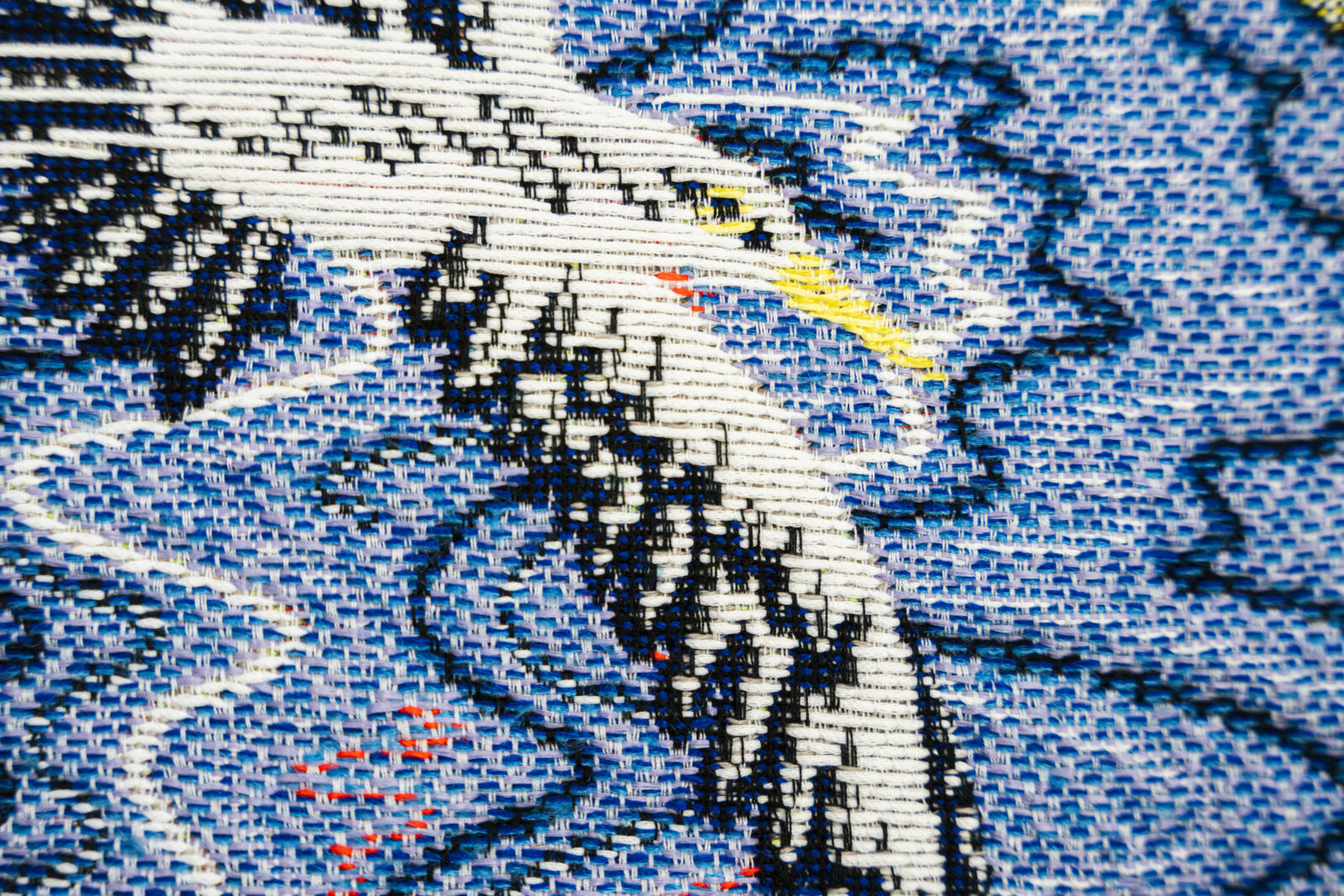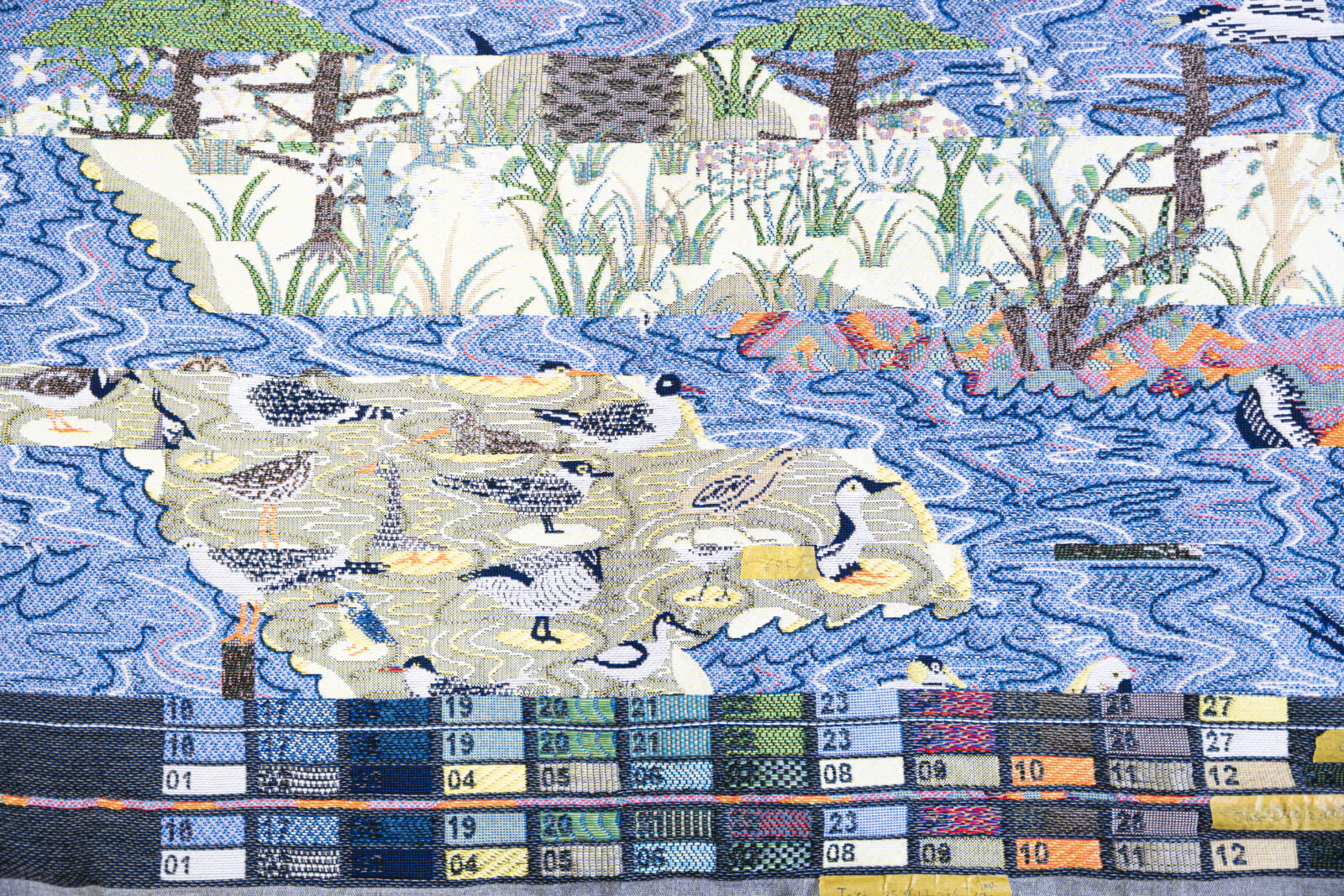 Taselaar incorporated recognisable references to the festival and the island of Vlieland, such as birds, nature, and subtle nods to the festival landscape, including a hidden piece of litter. Having worked frequently in the TextielLab, he drew on favourite weave structures that give the piece rhythm and texture.