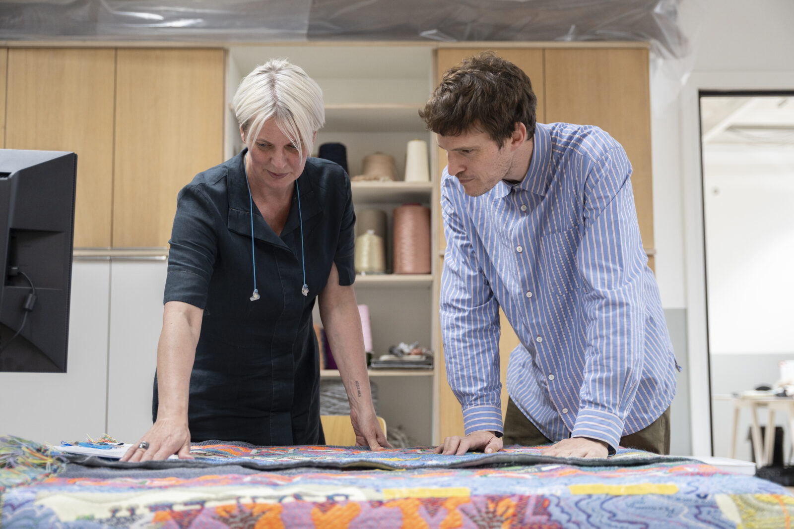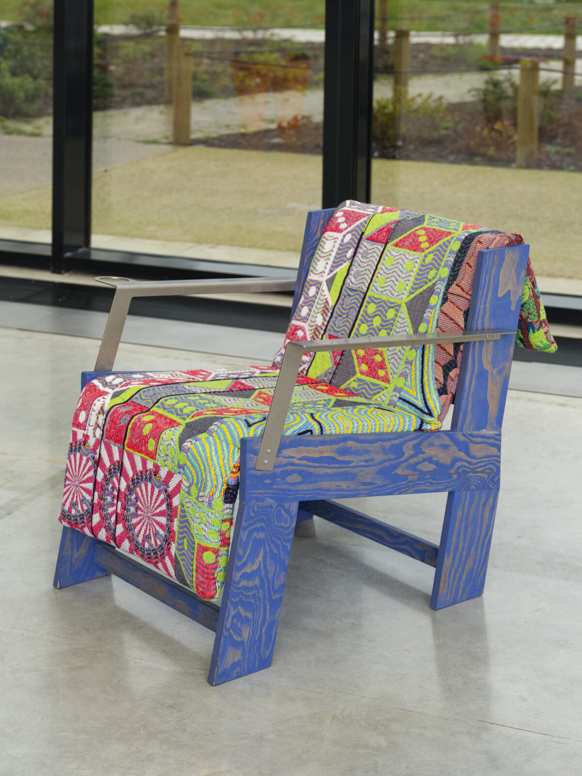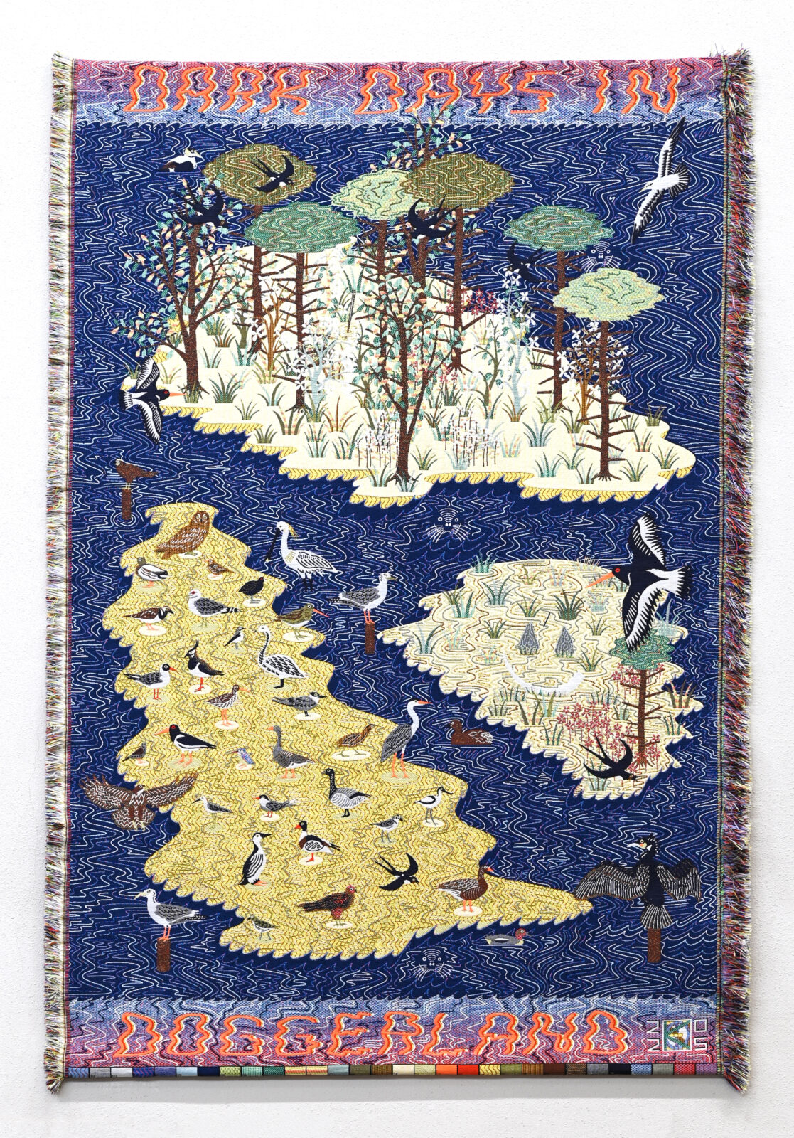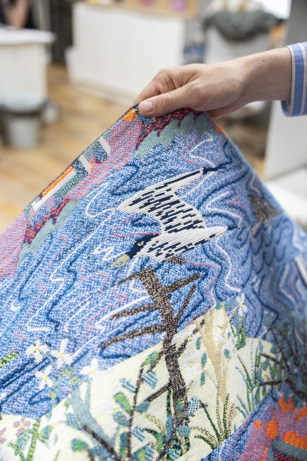 Taselaar incorporated recognisable references to the festival and the island of Vlieland, such as birds, nature, and subtle nods to the festival landscape, including a hidden piece of litter. Having worked frequently in the TextielLab, he drew on favourite weave structures that give the piece rhythm and texture.