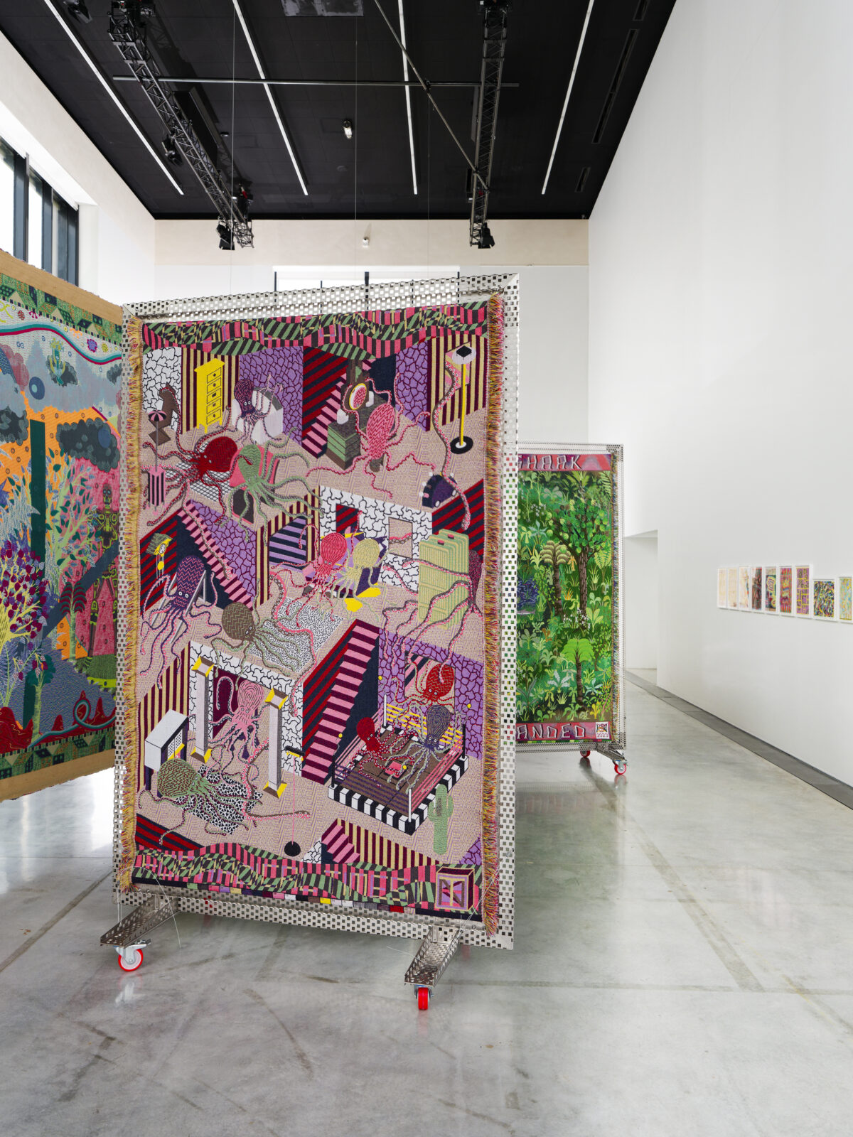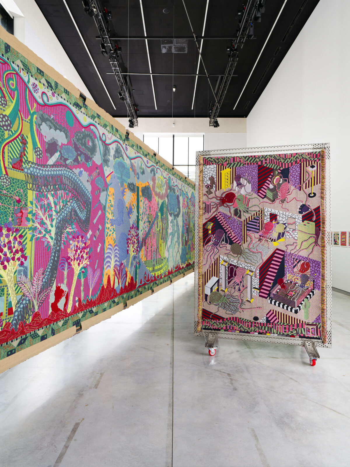 ‘End And’ is a large woven wall hanging by Koen Taselaar, inspired by the medieval Apocalypse Tapestry of Angers, a monumental 14th-century tapestry that visually narrates the Biblical story of the Apocalypse. The work presents a colourful parade of possible end-of-world scenarios, where religion, history, science and popular culture intersect. Taselaar explores how each generation depicts its own fears of the world’s end, from Biblical prophecies and natural disasters to nuclear weapons, the climate crisis and AI.