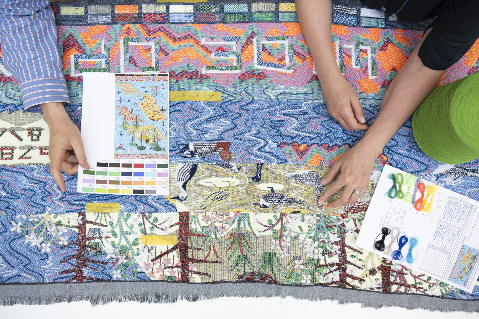 The wall hanging measures 19 metres long and 3.5 metres high, and was woven on a computer-controlled Jacquard loom, making it readable from both sides. Like its historical counterpart, this work bears the marks of its own time: humour and irony coexist with existential threats. By letting layers of time collide, Bauhaus alongside science fiction, microorganisms alongside cosmic catastrophes, Taselaar creates a complex narrative in which history is presented as an ongoing tapestry of repeated fears and human imagination.