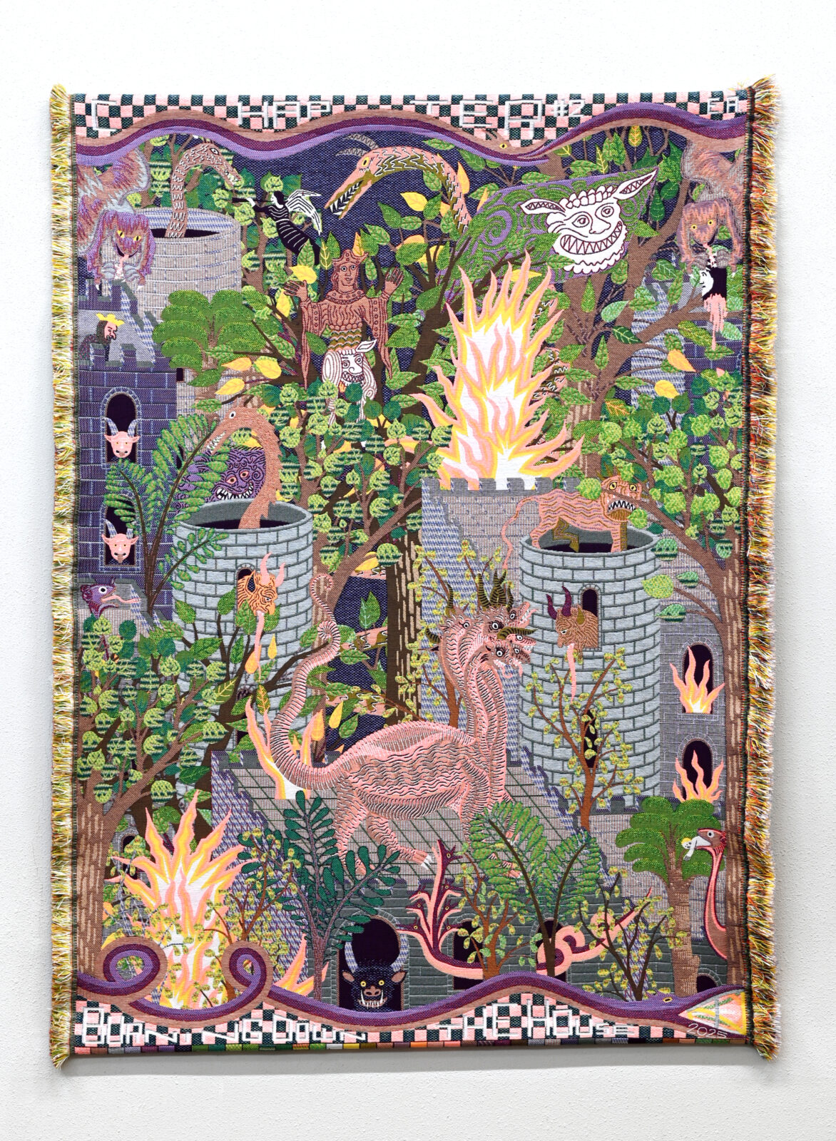 Alongside the large wall hanging, Koen Taselaar developed a series of smaller textiles in the TextielLab, such as ‘Dark Days in Doggerland’ and ‘Burning Down The House’, which build on his apocalyptic visual language both conceptually and visually. Some works are directly derived from ‘End And’, while others function as independent chapters within the same universe.