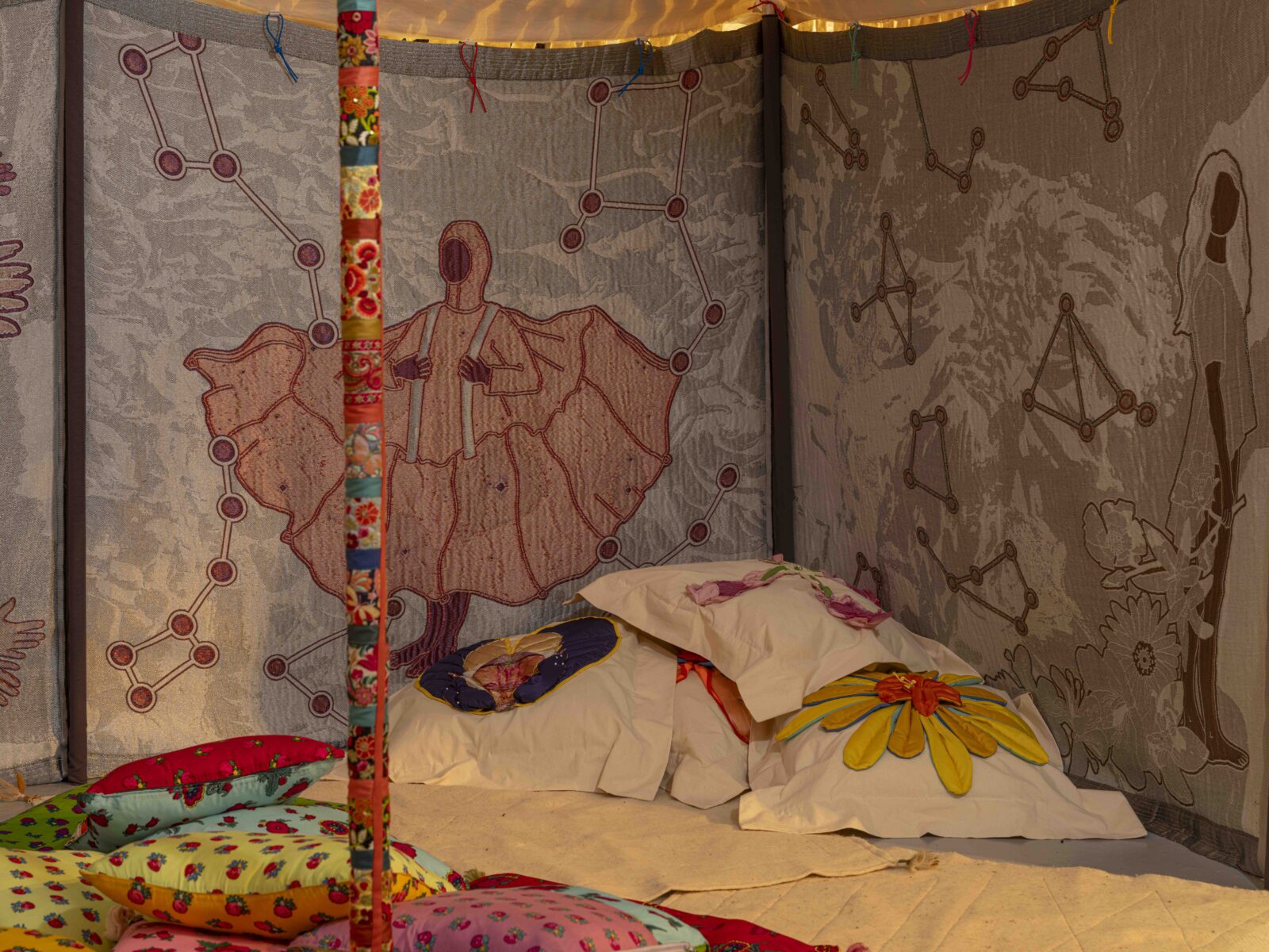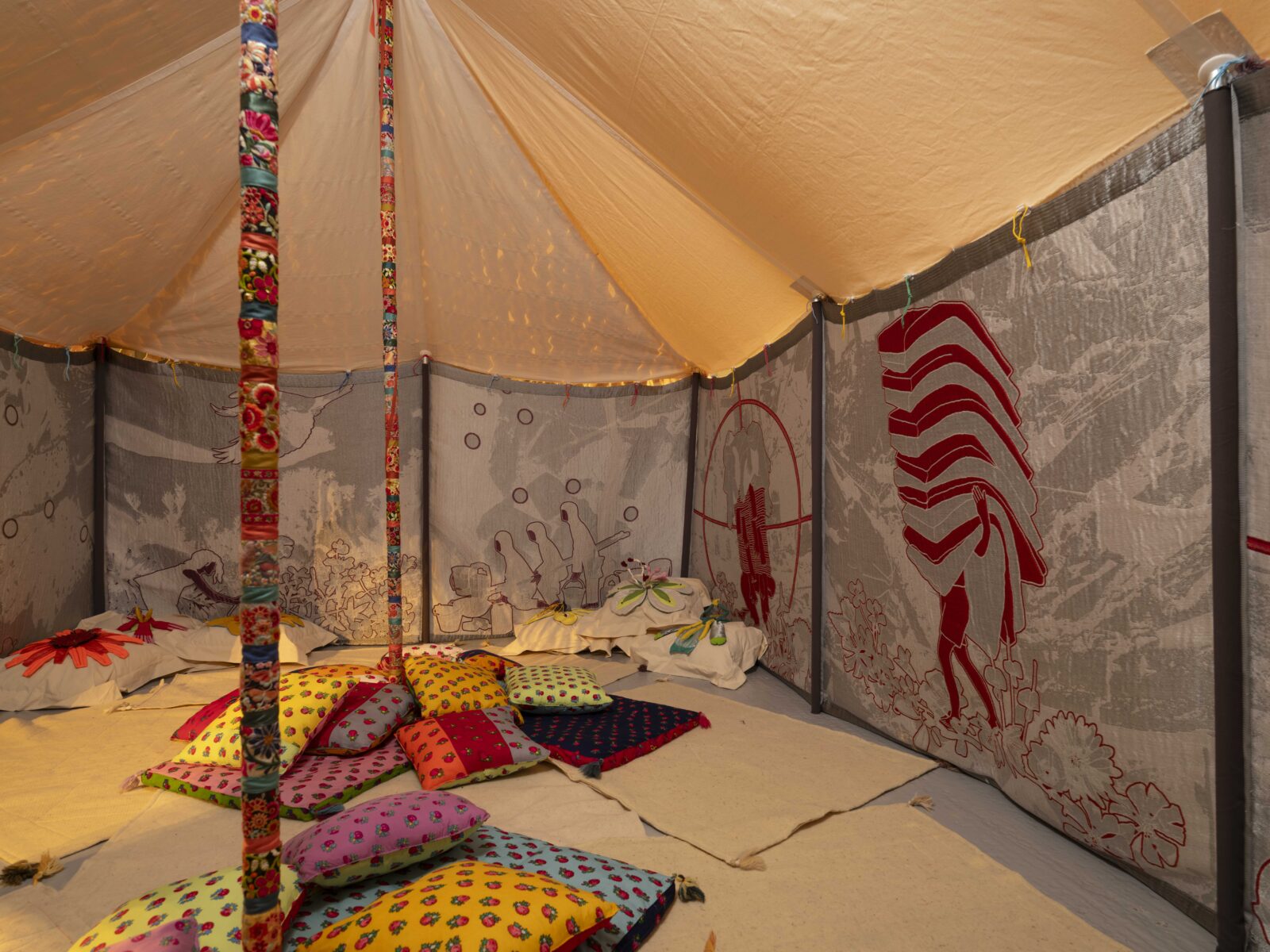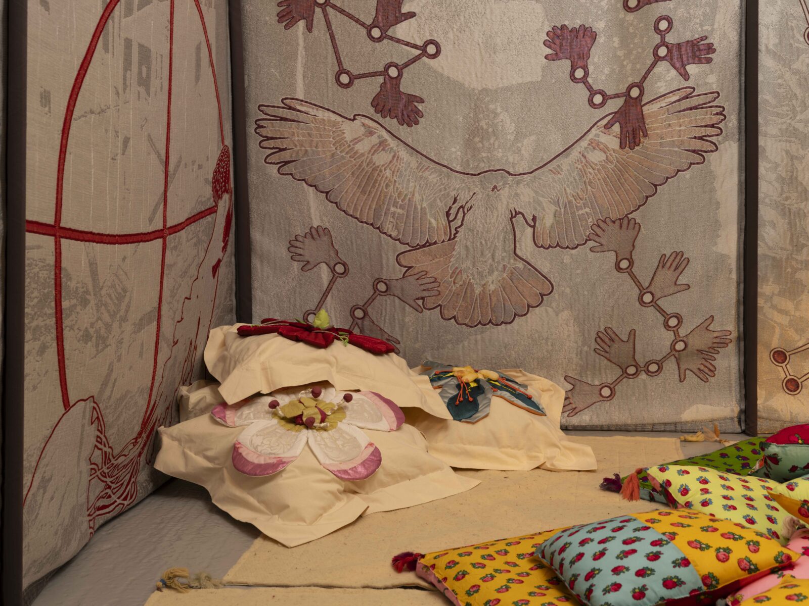 ‘Bayt Al Sha’ar – House of Hair’ by Lucy Orta consists of nine Jacquard-woven wall hangings that together form a full-scale Bedouin tent measuring 5 by 3.5 metres. The designs combine photography with hand-drawn illustrations; to emphasise the contrast in materiality, the photographs are woven in soft, matte merino wool yarns, while the illustrations are woven in glossy recycled PET yarns. As a result, each of the nine hangings is unique, yet they follow the same compositional structure.