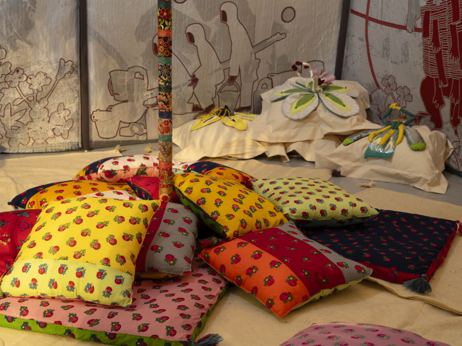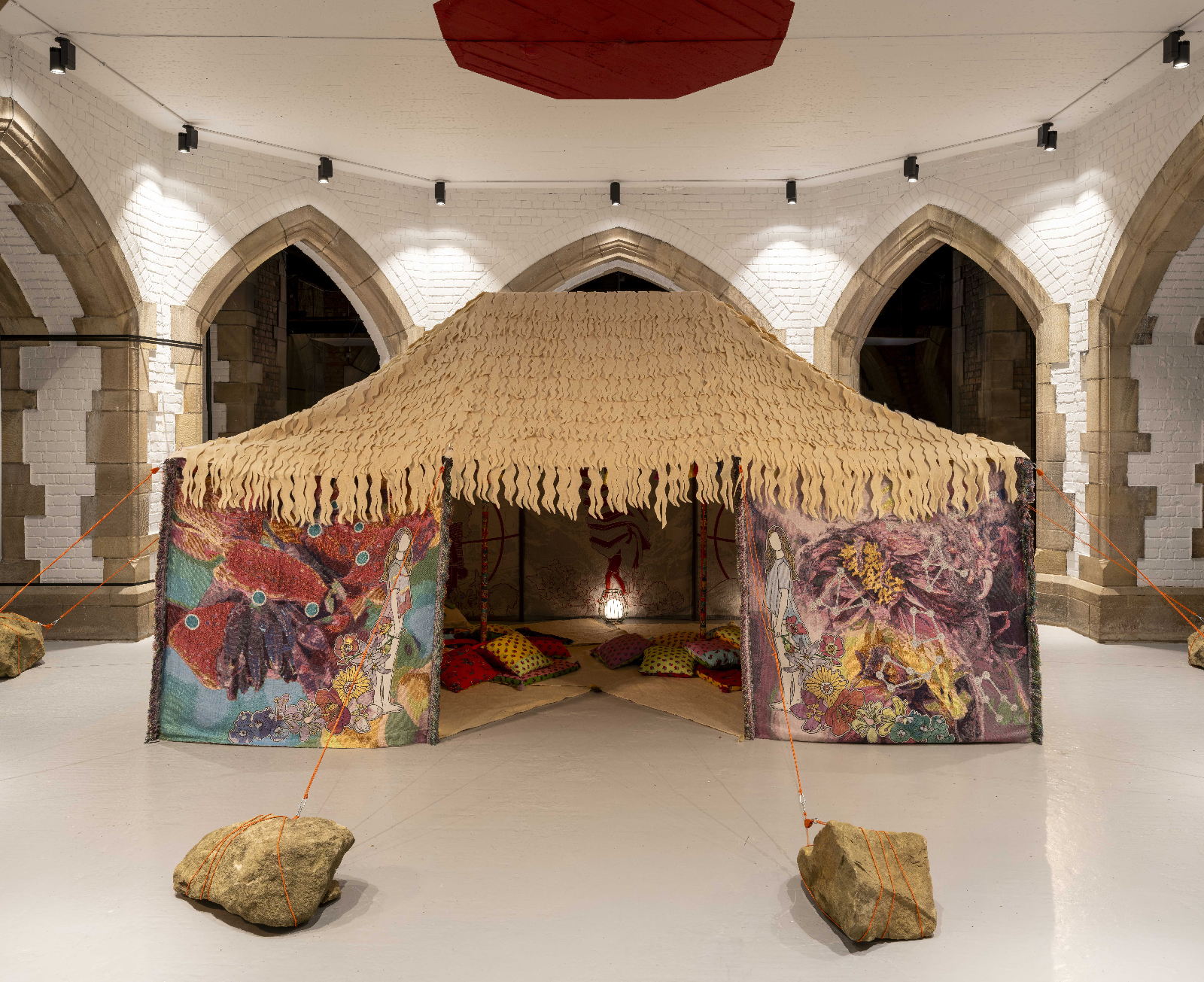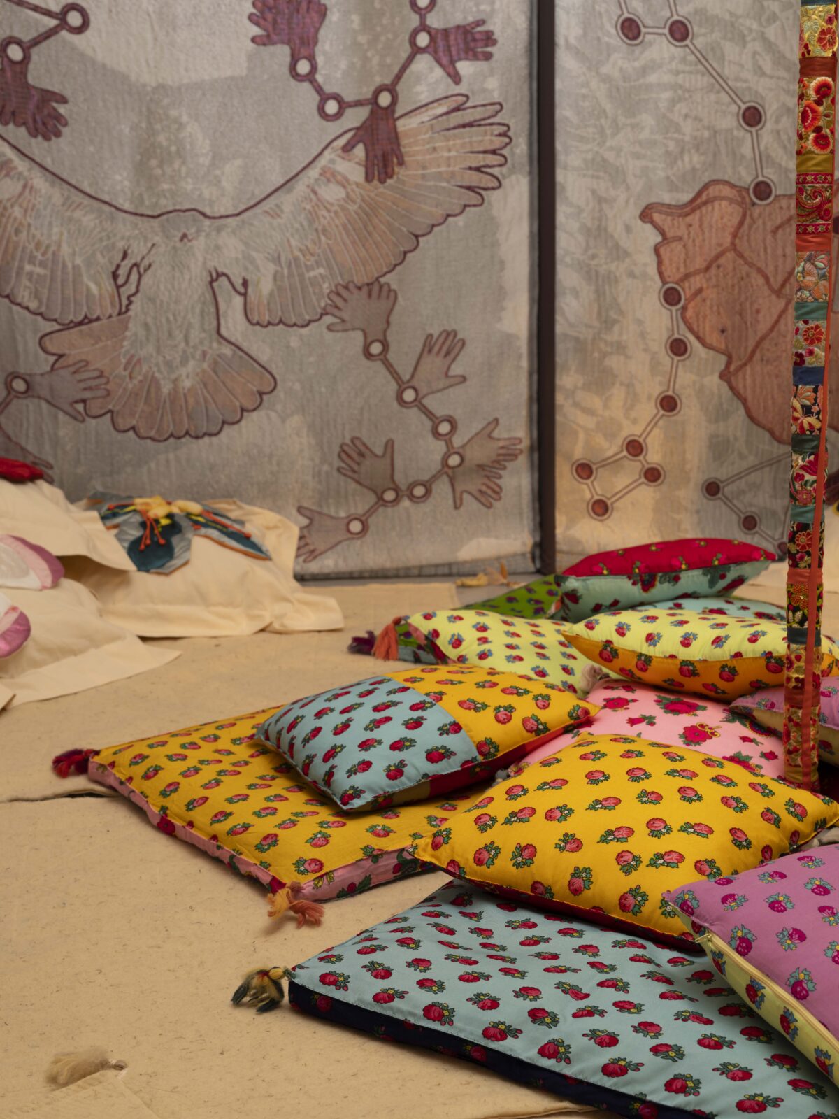 ‘Bayt Al Sha’ar – House of Hair’ by Lucy Orta consists of nine Jacquard-woven wall hangings that together form a full-scale Bedouin tent measuring 5 by 3.5 metres. The designs combine photography with hand-drawn illustrations; to emphasise the contrast in materiality, the photographs are woven in soft, matte merino wool yarns, while the illustrations are woven in glossy recycled PET yarns. As a result, each of the nine hangings is unique, yet they follow the same compositional structure.