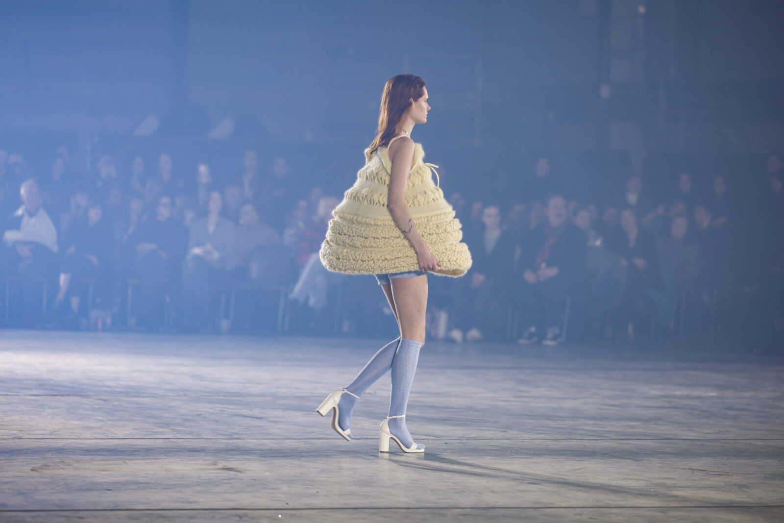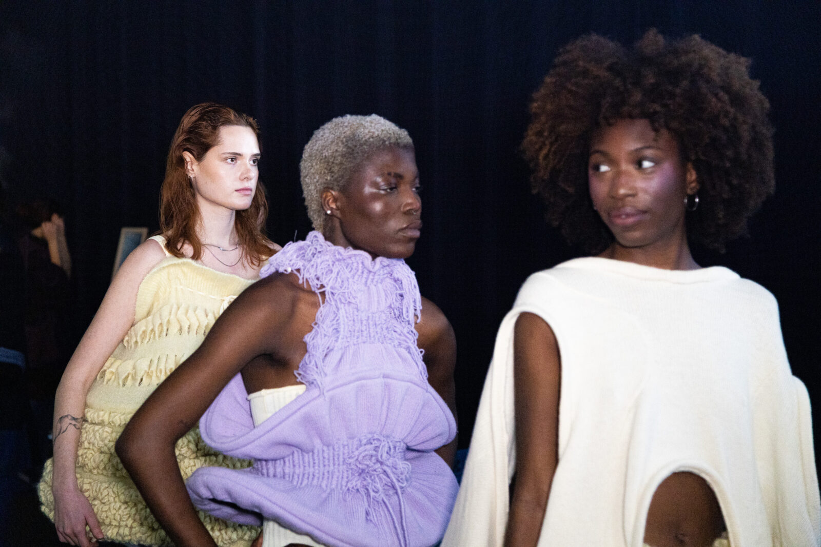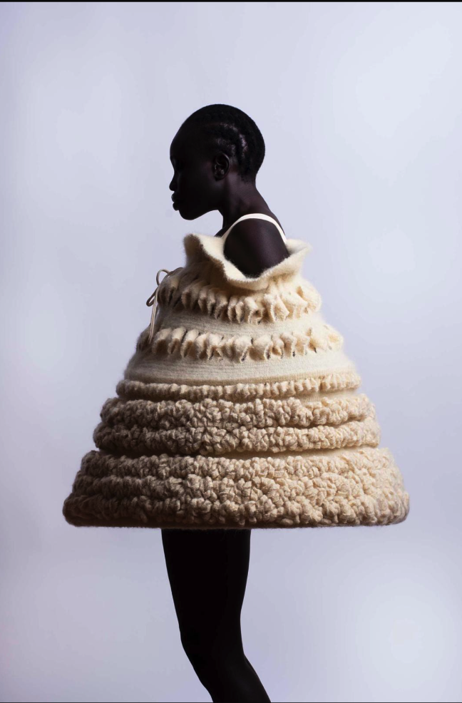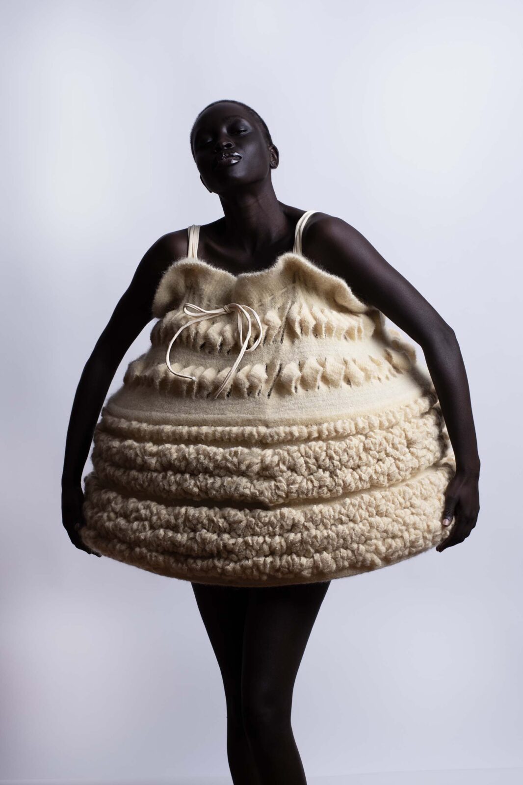 Marije van de Voort developed ‘Sensory Threads’, a dress that is part of her graduation collection and offers a sensory experience where fashion and environment merge. The work invites exploration of textiles through touch, movement, and personal interaction, emphasising the importance of tactility as a counterbalance to the digital world. The dress was made on a computer-controlled flat knitting machine, using mohair and elastic yarns to support both shape and flexibility. Baleen (reinforcement pieces) was added to create a rounded, sculptural circle.