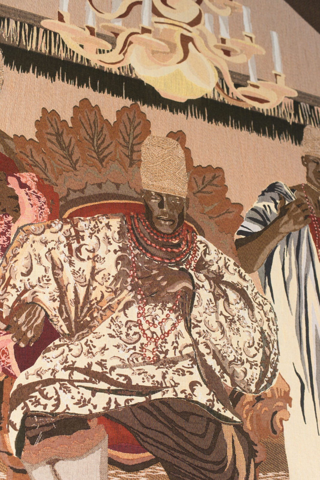 The tapestry was created using the traditional Gobelins weaving technique, in which coloured threads are combined to form an image. Through this method, the artists symbolically reclaim control over a history that was previously represented largely from a one-sided, colonial perspective.