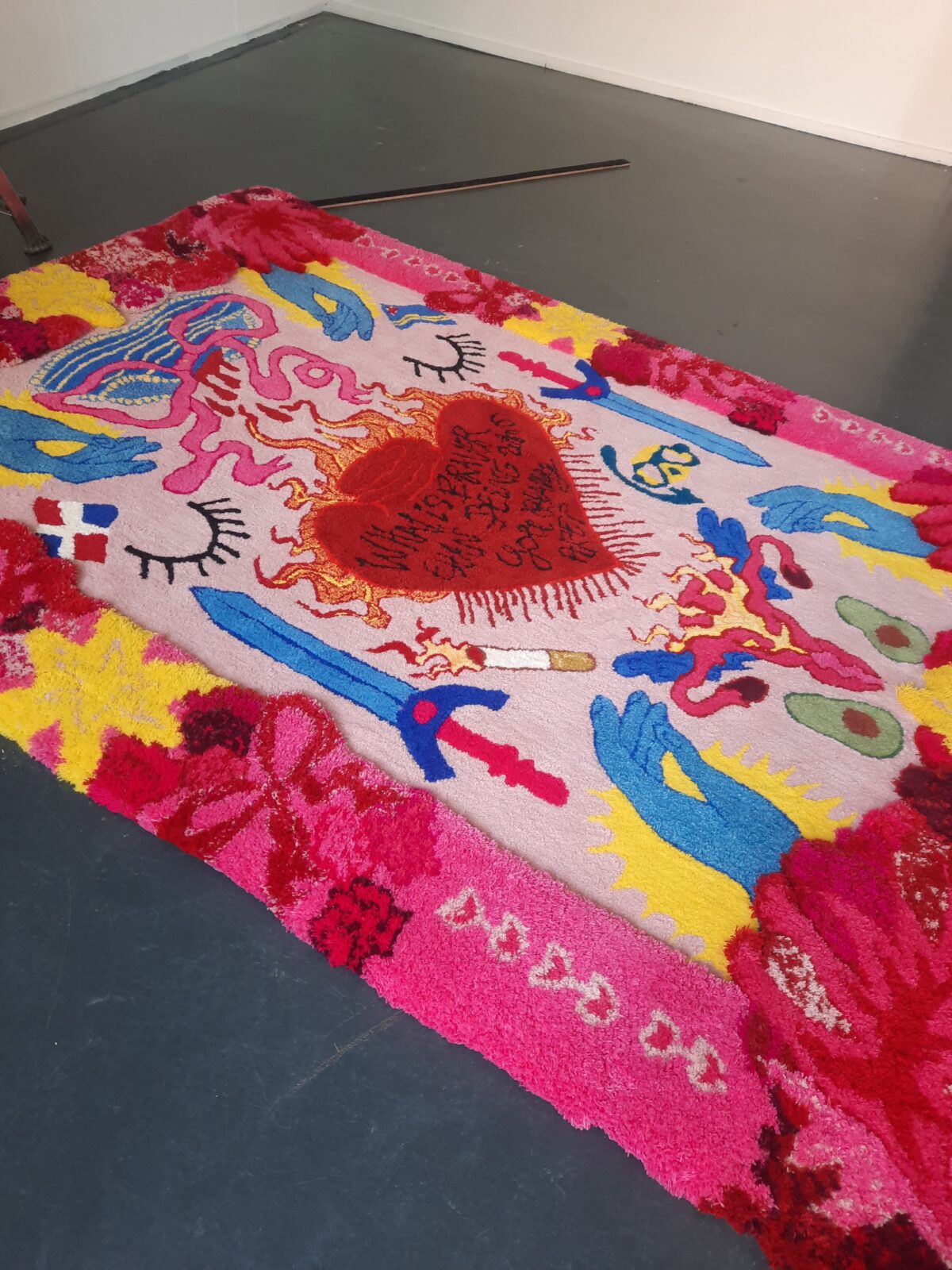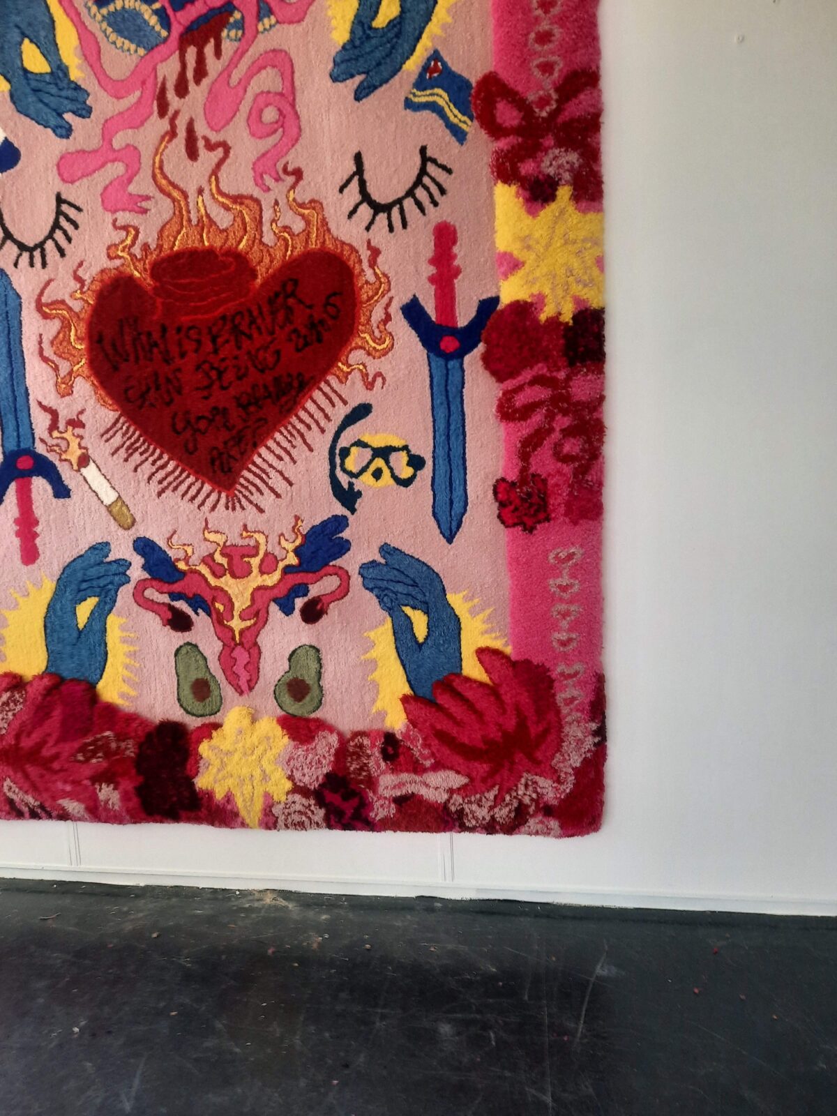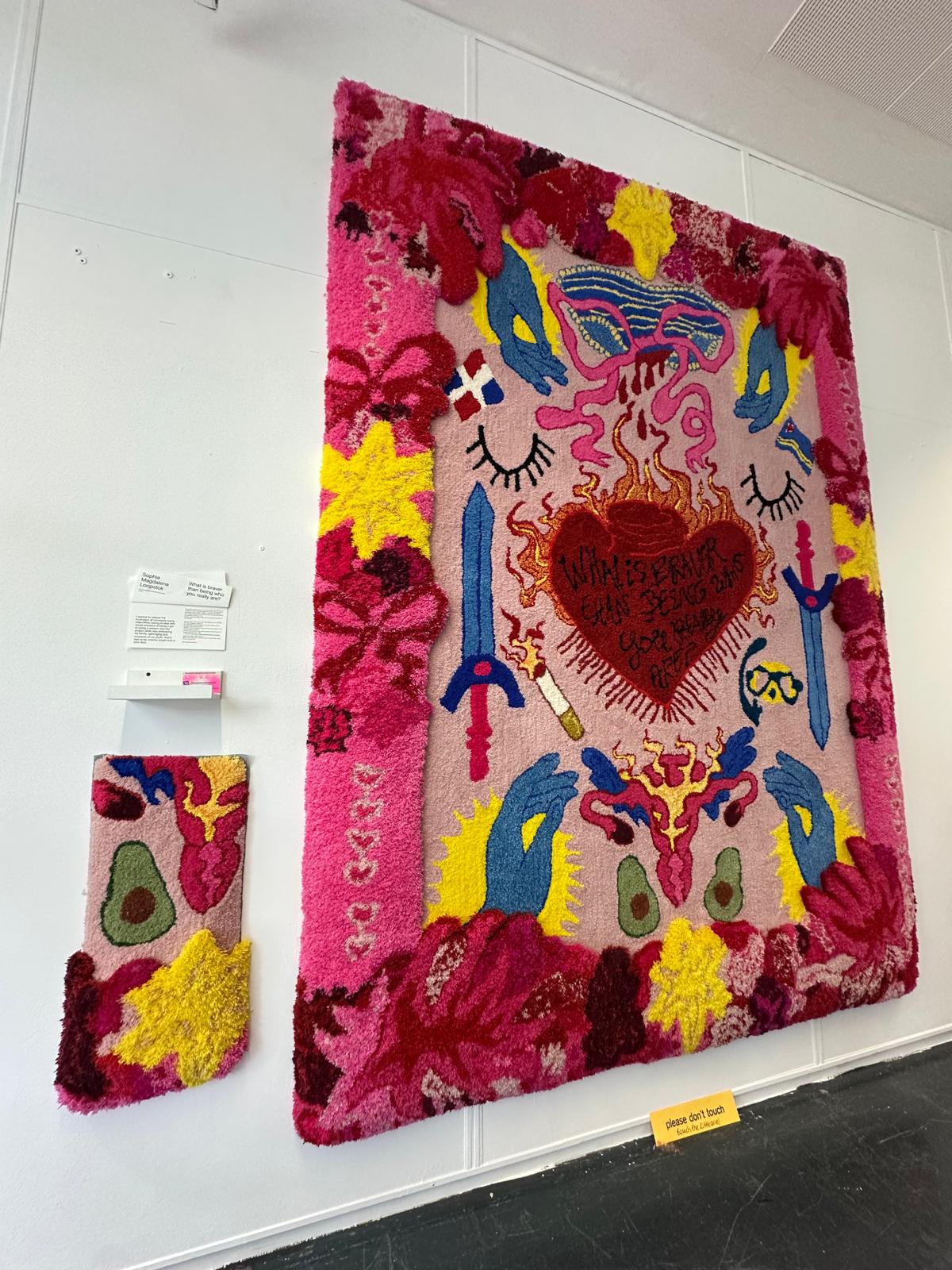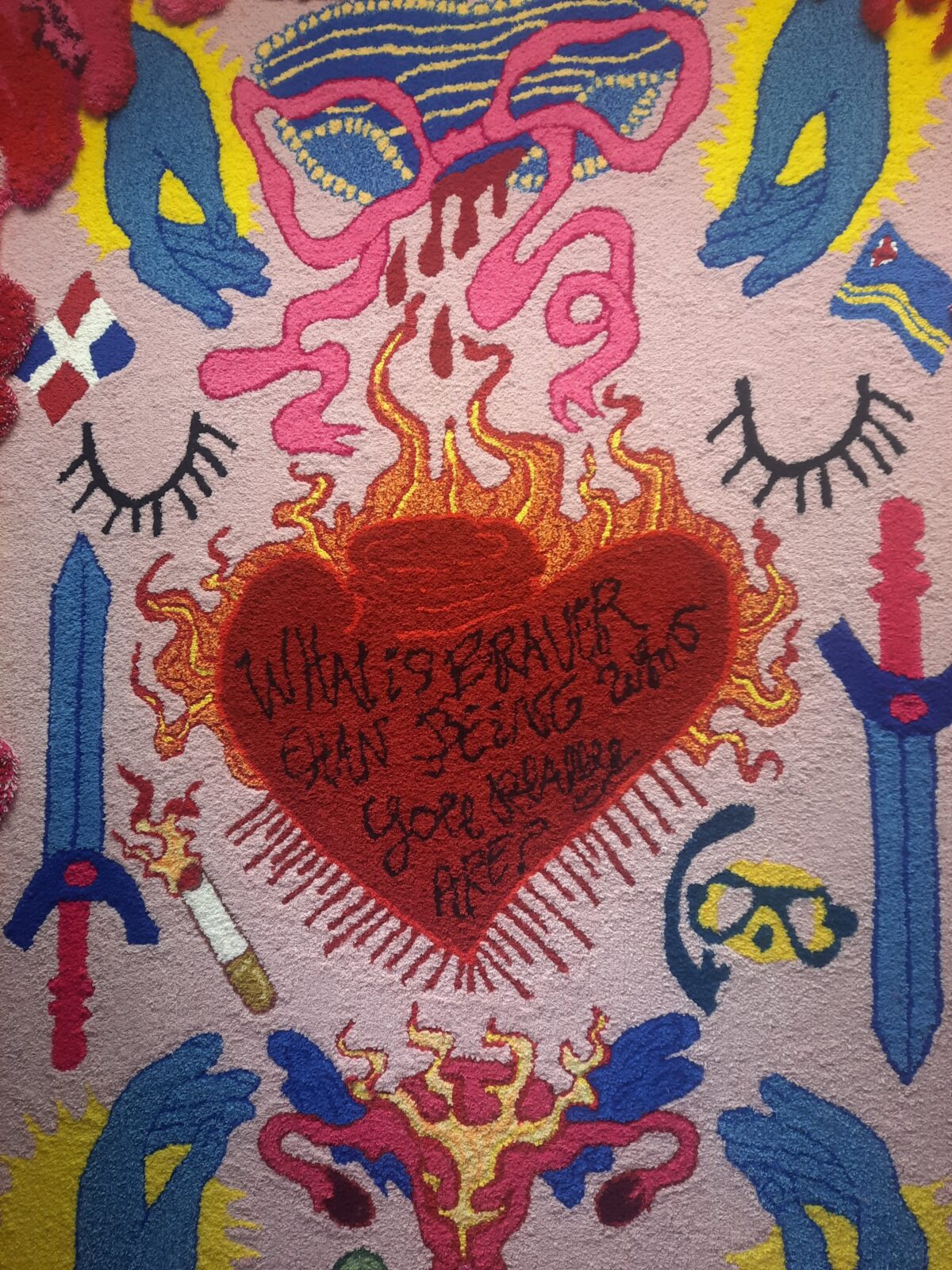 ‘What is braver than being who you really are?’ is a tufted wall tapestry. The work translates personal childhood memories and social observations into a colourful, graphic composition in which moments such as a first period, a smoking grandmother, snorkelling with her father, and secondary school experiences come together. The tapestry reflects on identity, feminism, growing up with immigrant parents, and the courage to be oneself. It combines a playful visual language with symbolism, including the motif of the ‘flying uterus’.