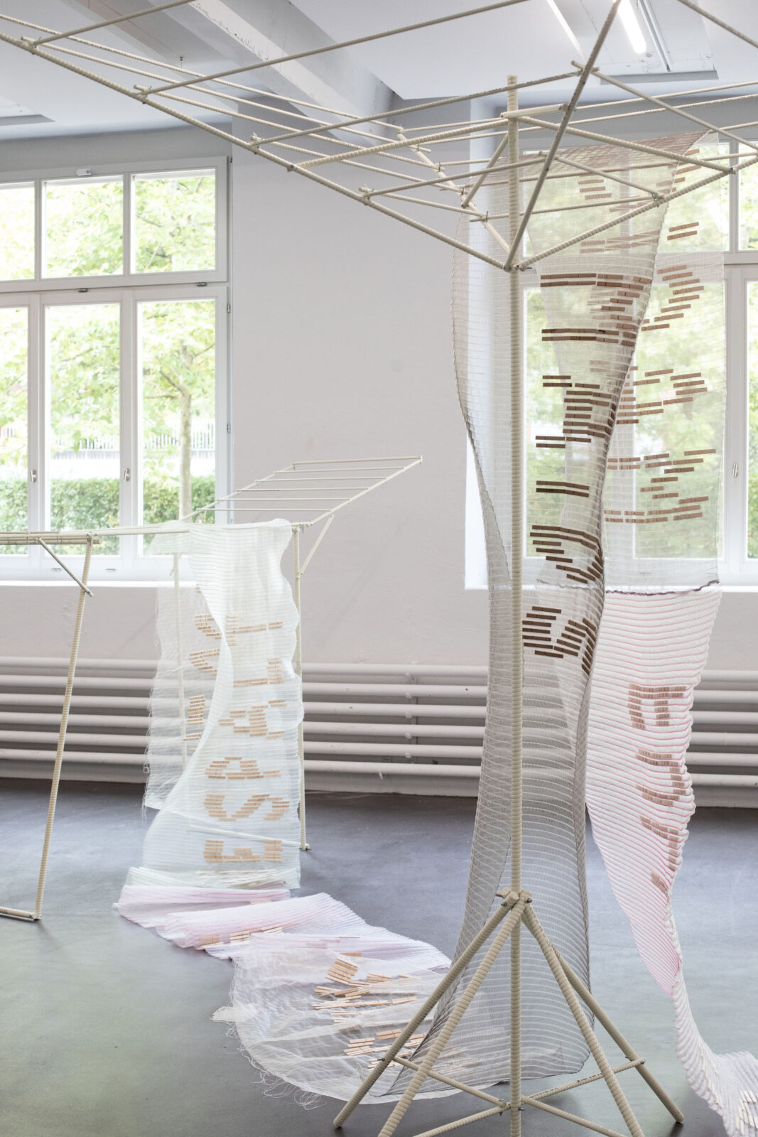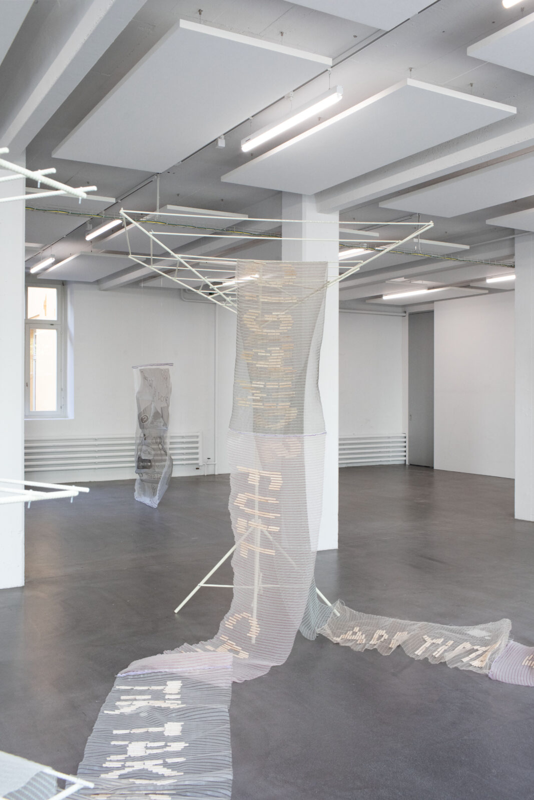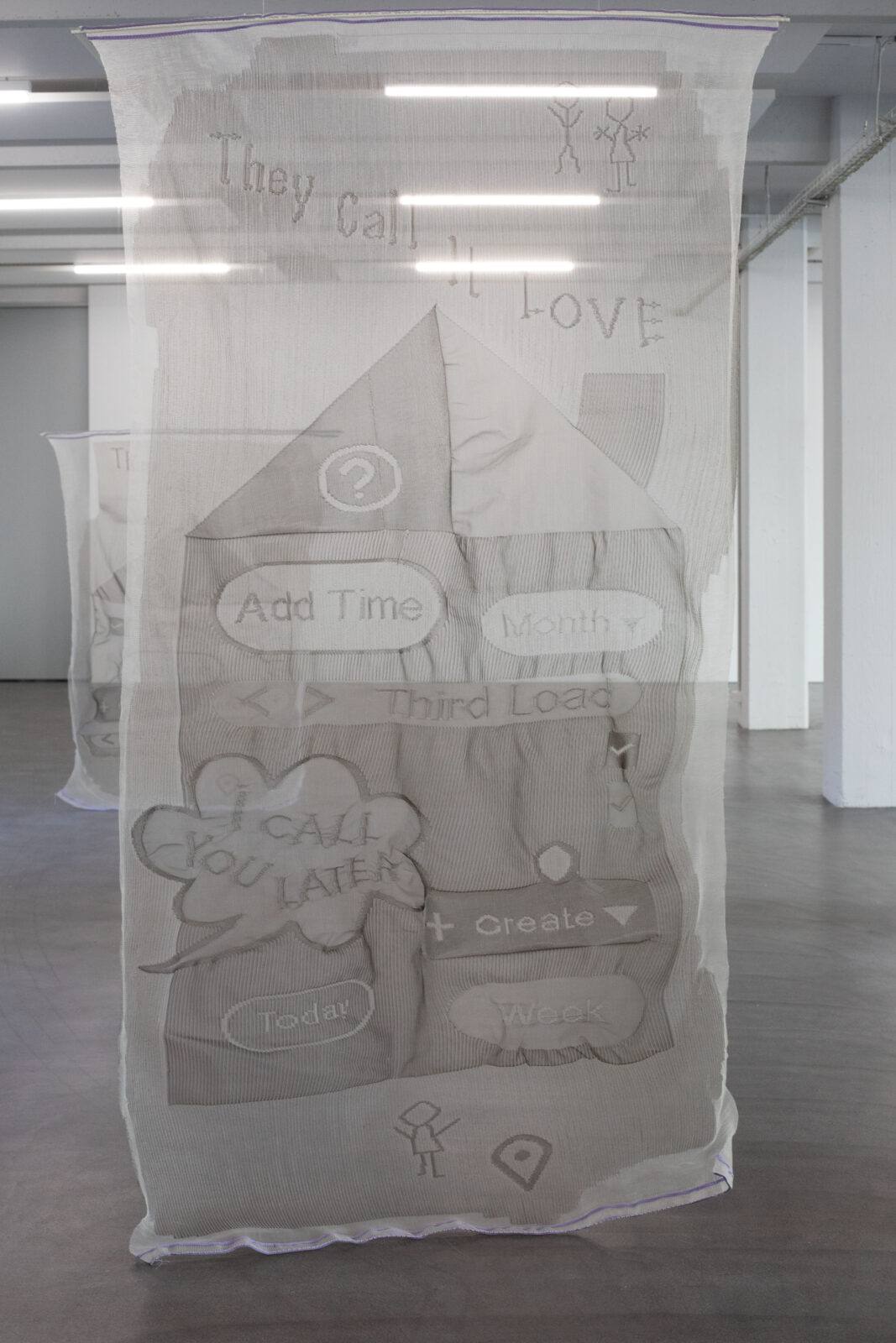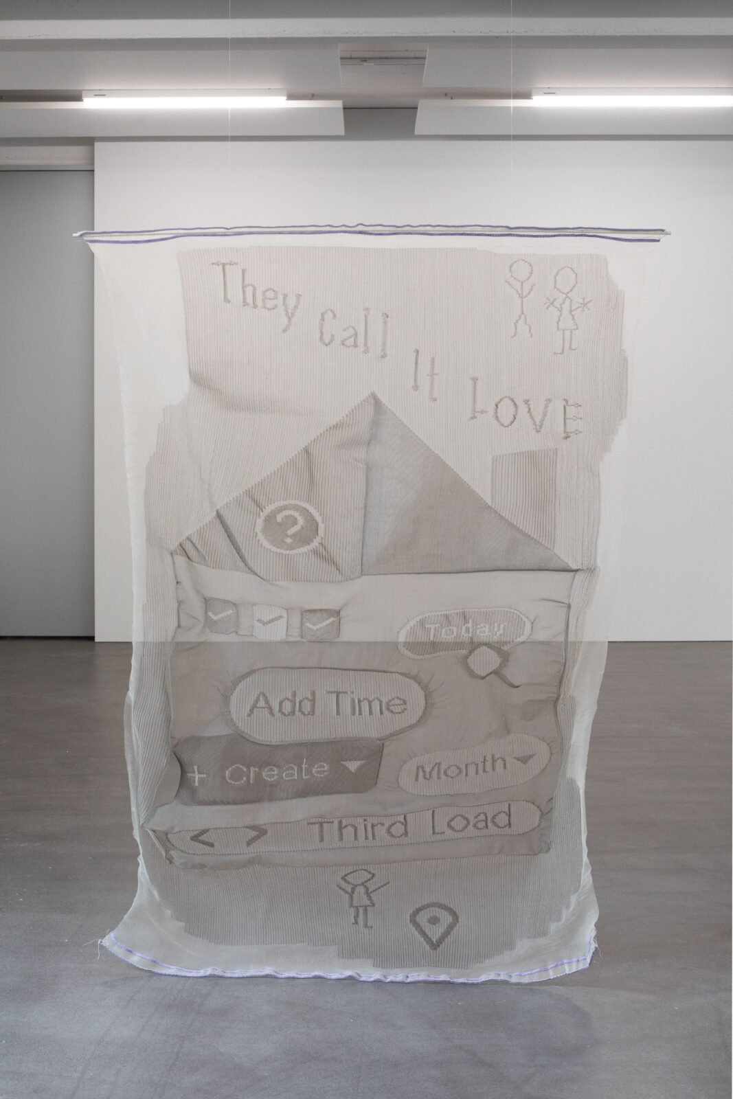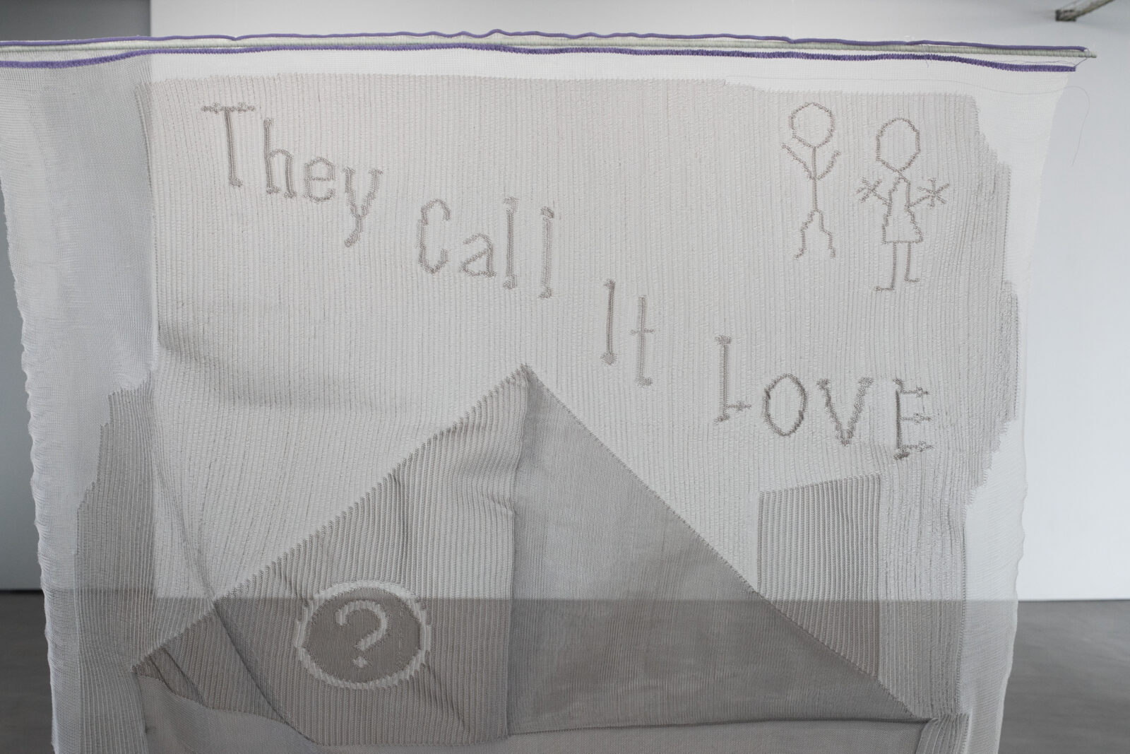 The project ‘They Call It Love’ by Stéphanie Baechler explores the subtle structures that hold our society together: care, maintenance, and everyday organisation. At its centre is a specially developed work, produced on a computer-controlled circular knitting machine, which is both transparent and elastic, interwoven with symbols and fragments of text. The material unfolds into an installation in which textile and sculpture converge.