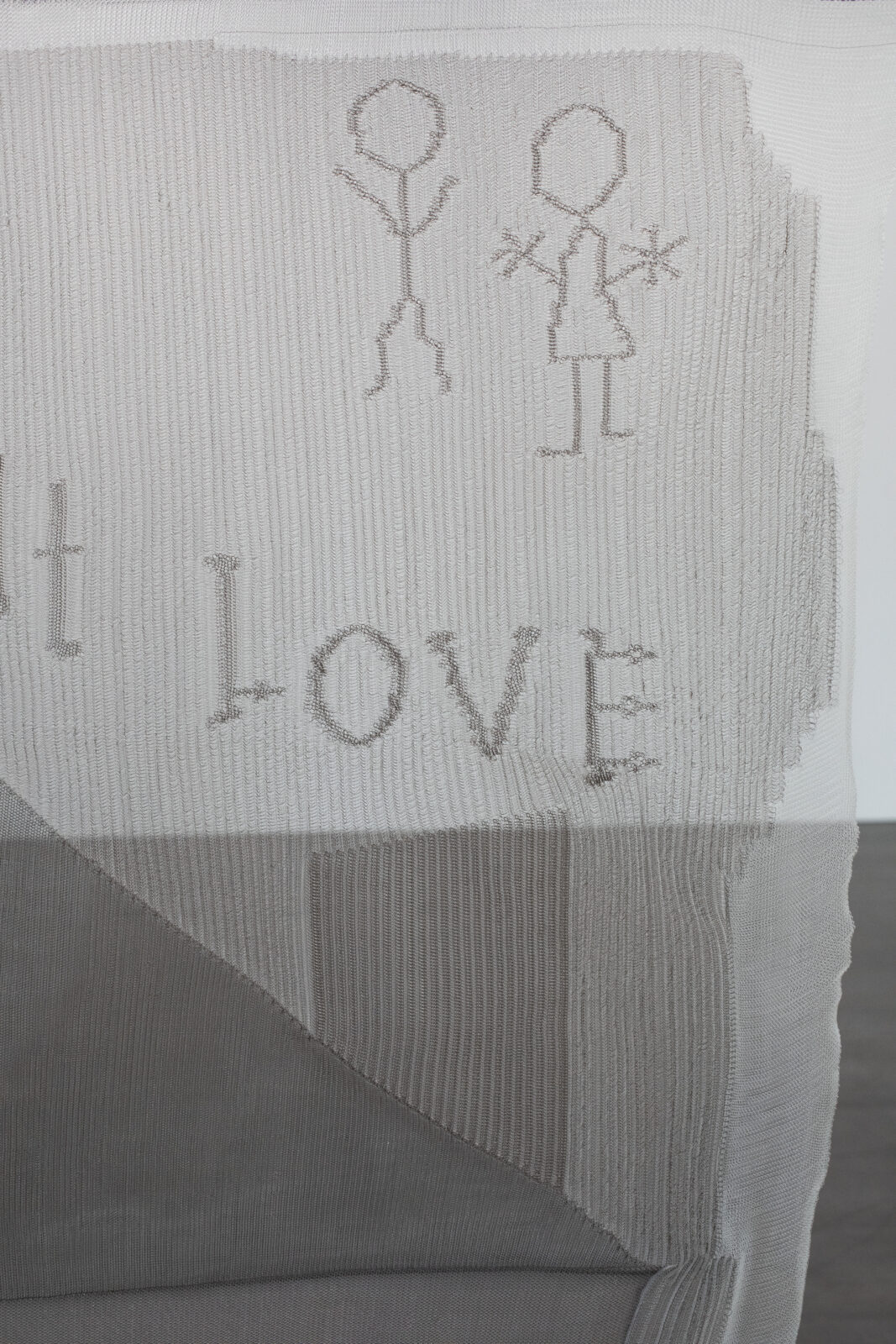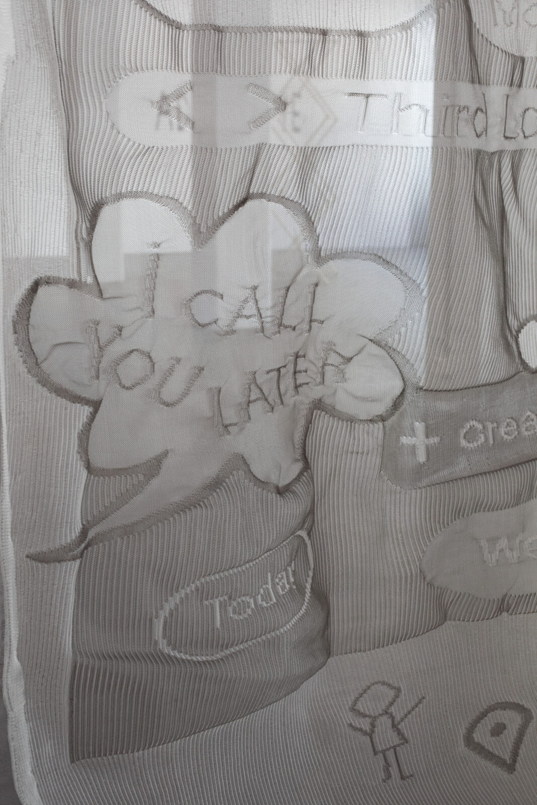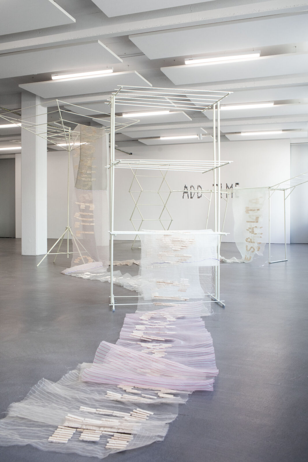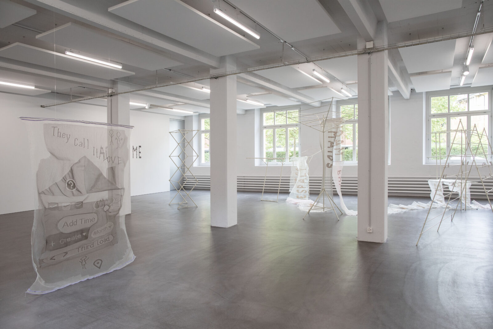 The project ‘They Call It Love’ by Stéphanie Baechler explores the subtle structures that hold our society together: care, maintenance, and everyday organisation. At its centre is a specially developed work, produced on a computer-controlled circular knitting machine, which is both transparent and elastic, interwoven with symbols and fragments of text. The material unfolds into an installation in which textile and sculpture converge.