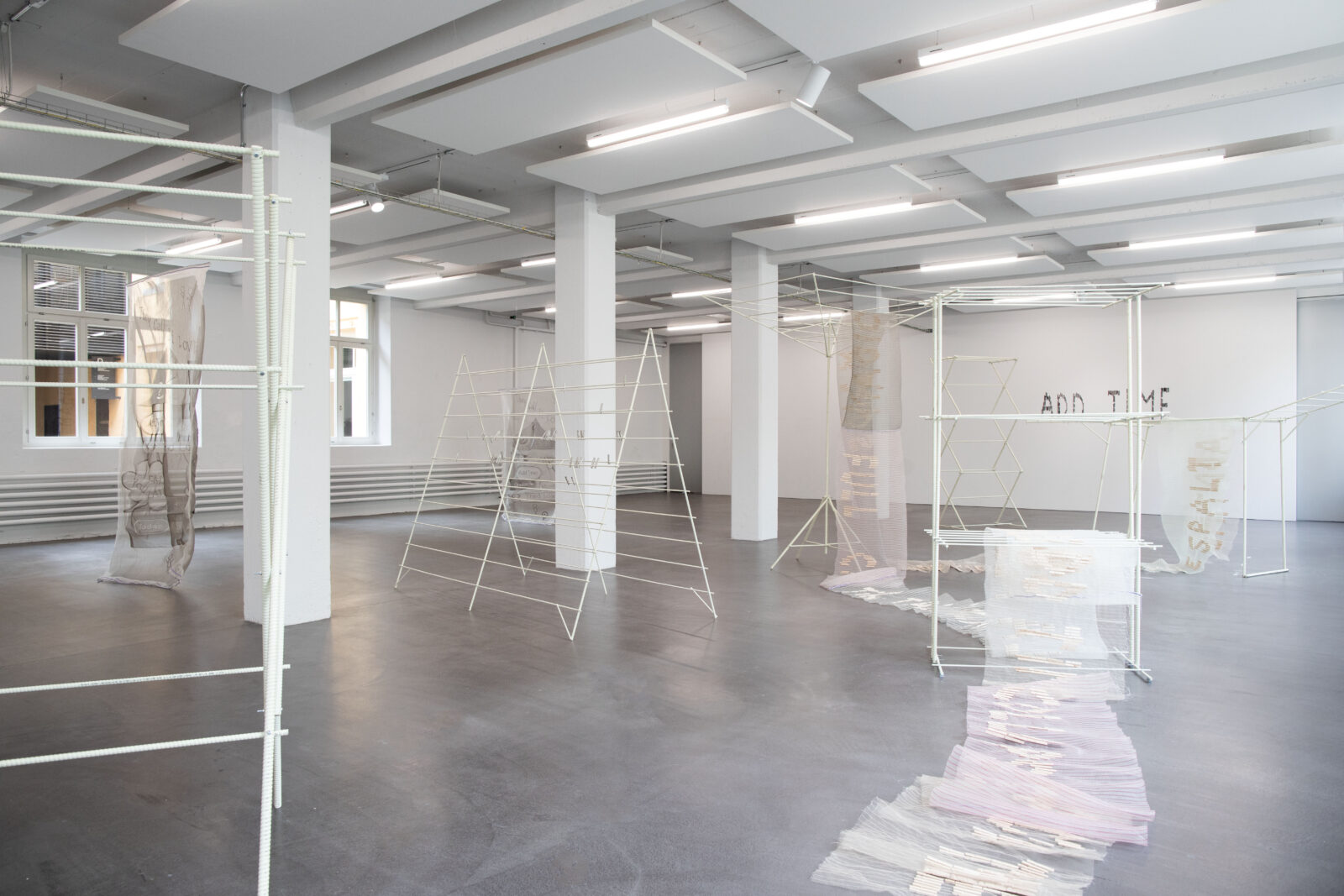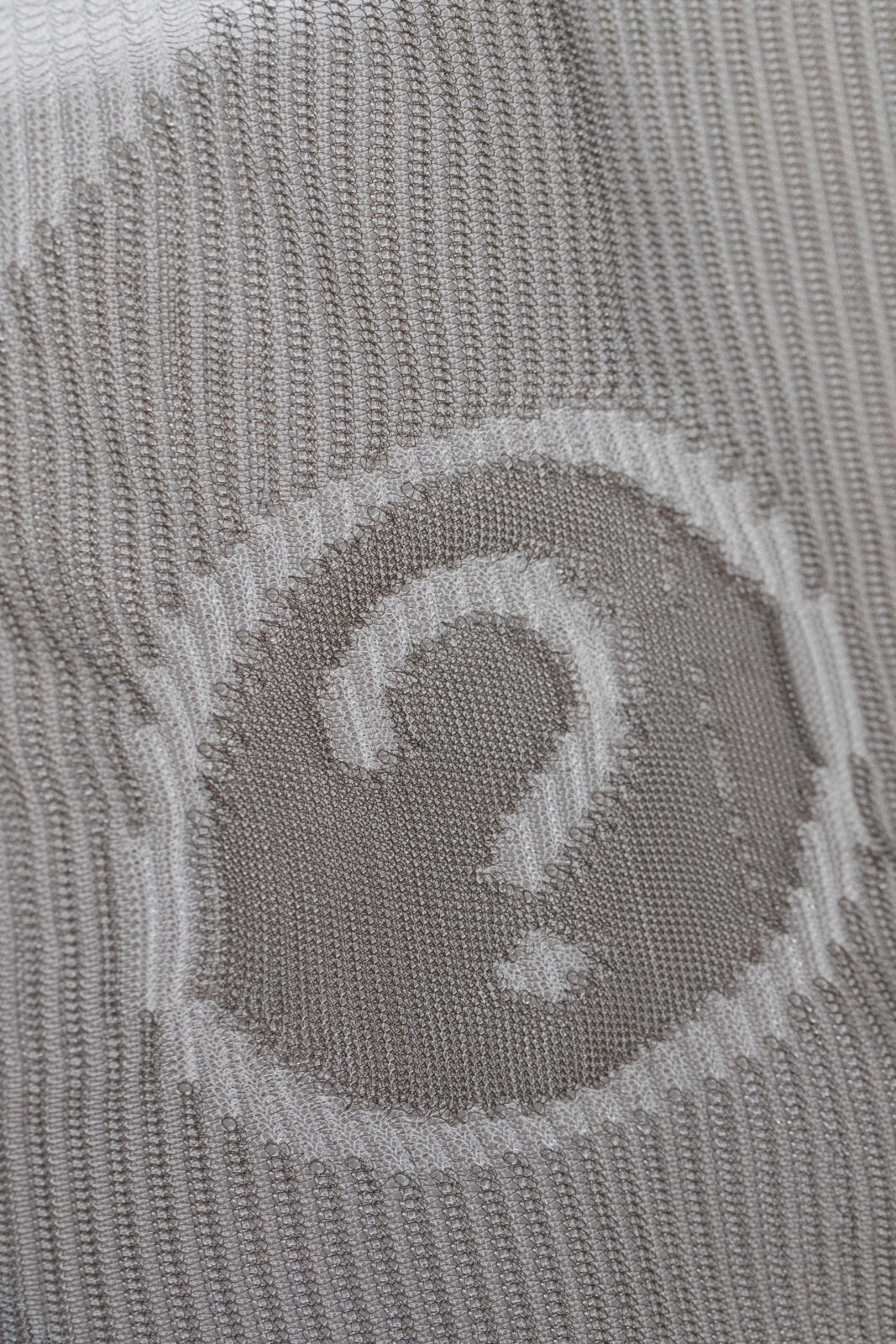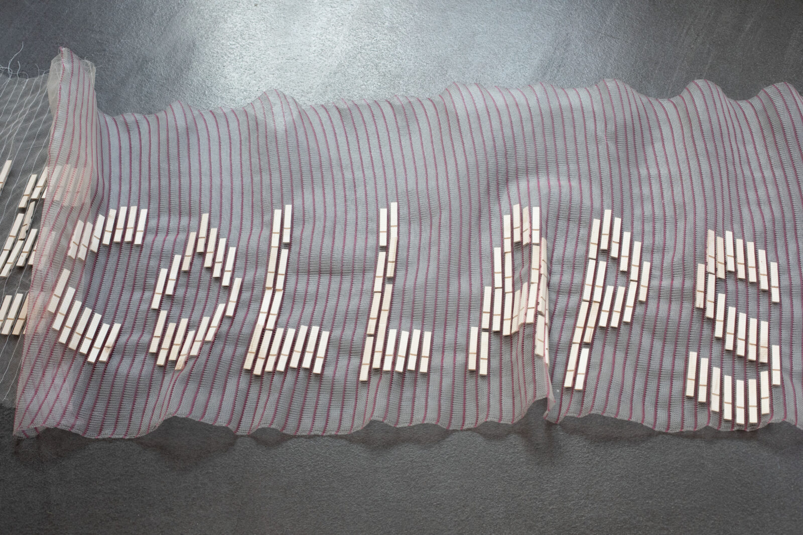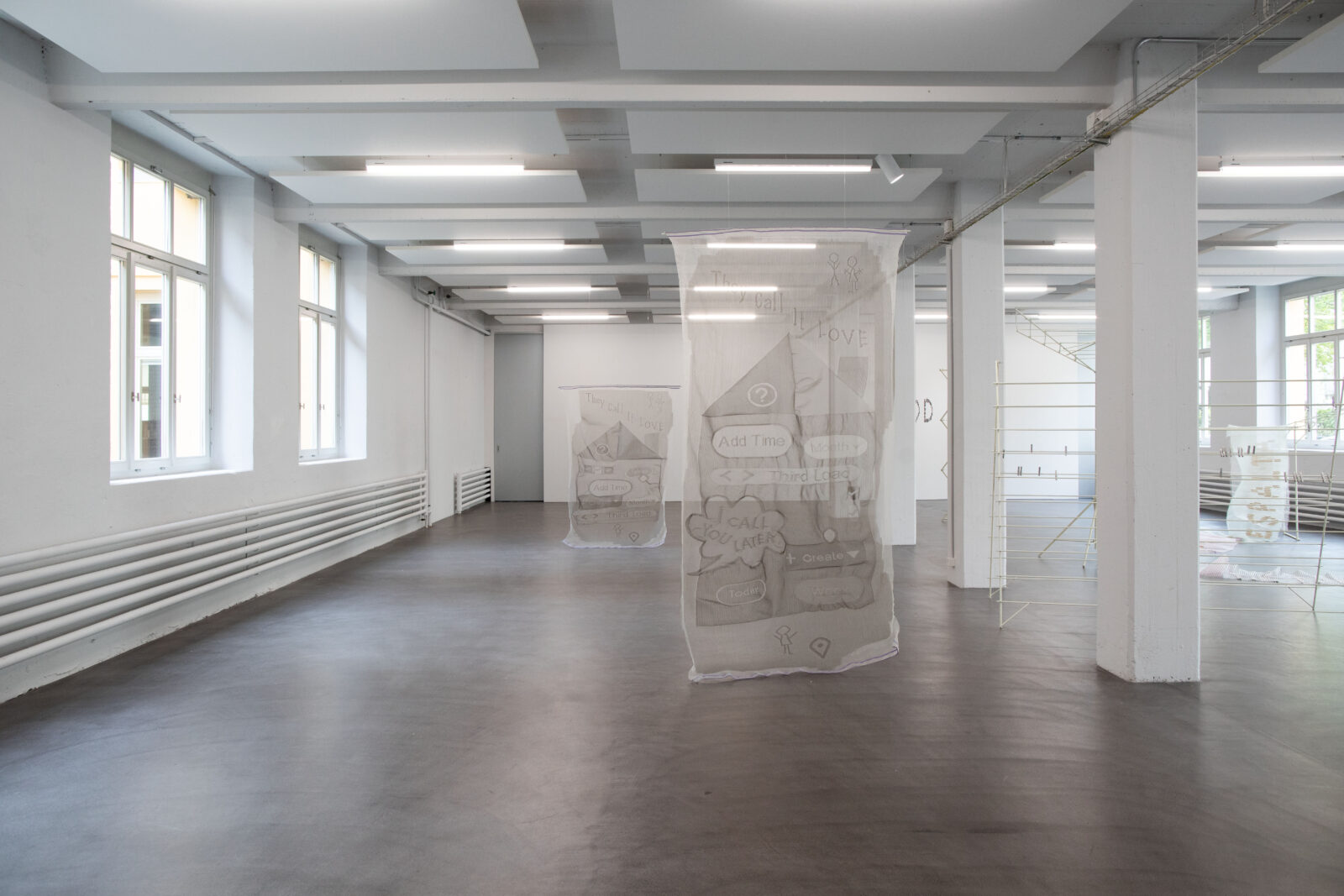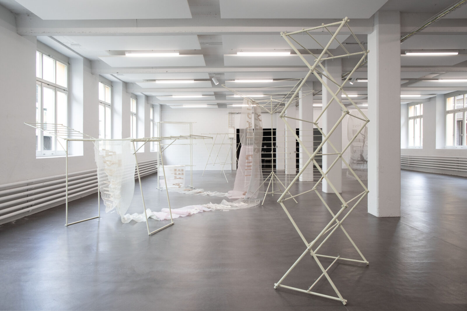 The project ‘They Call It Love’ by Stéphanie Baechler explores the subtle structures that hold our society together: care, maintenance, and everyday organisation. At its centre is a specially developed work, produced on a computer-controlled circular knitting machine, which is both transparent and elastic, interwoven with symbols and fragments of text. The material unfolds into an installation in which textile and sculpture converge.