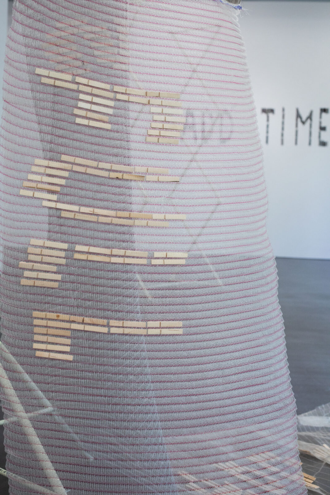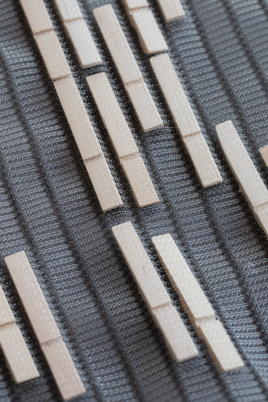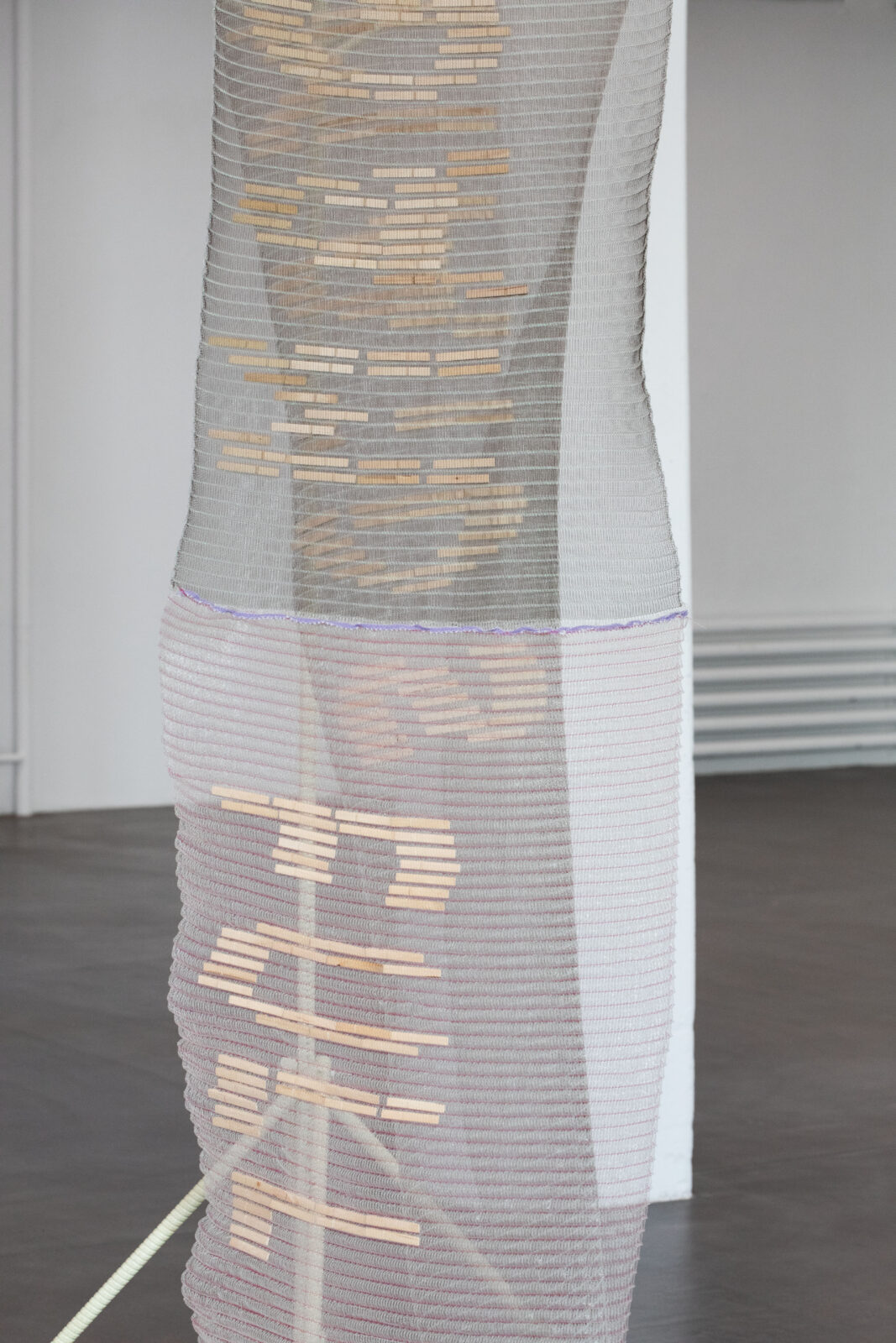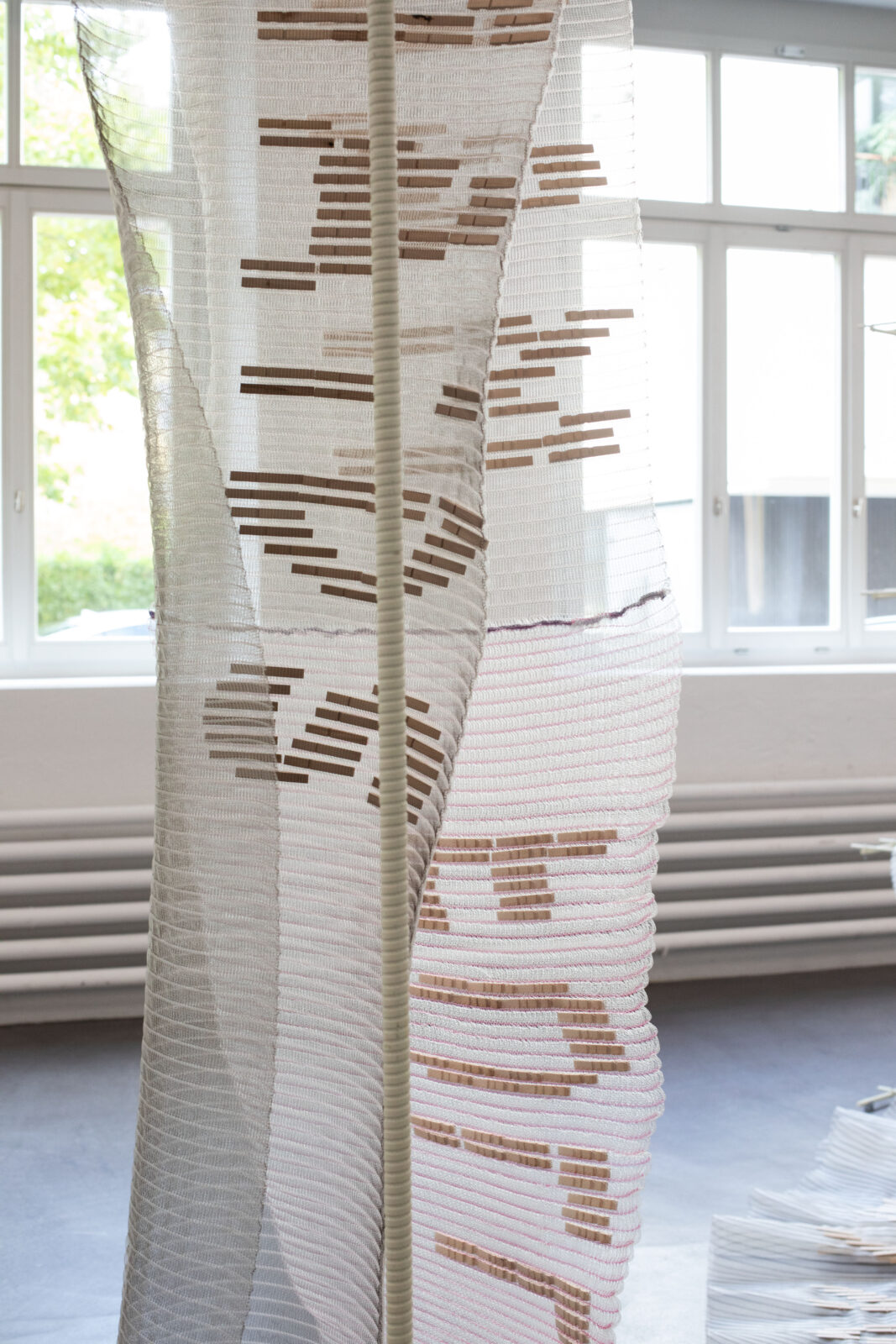 For this work, Baechler tested various combinations of recycled polyester monofilament. Two distinct fabrics were developed: one for a tube-like sculpture and one for a large wall hanging. Visibility, tactility, and graphic precision were central considerations, alongside the integration of personal themes such as motherhood and femininity, expressed in a crafted, drawing-like style.